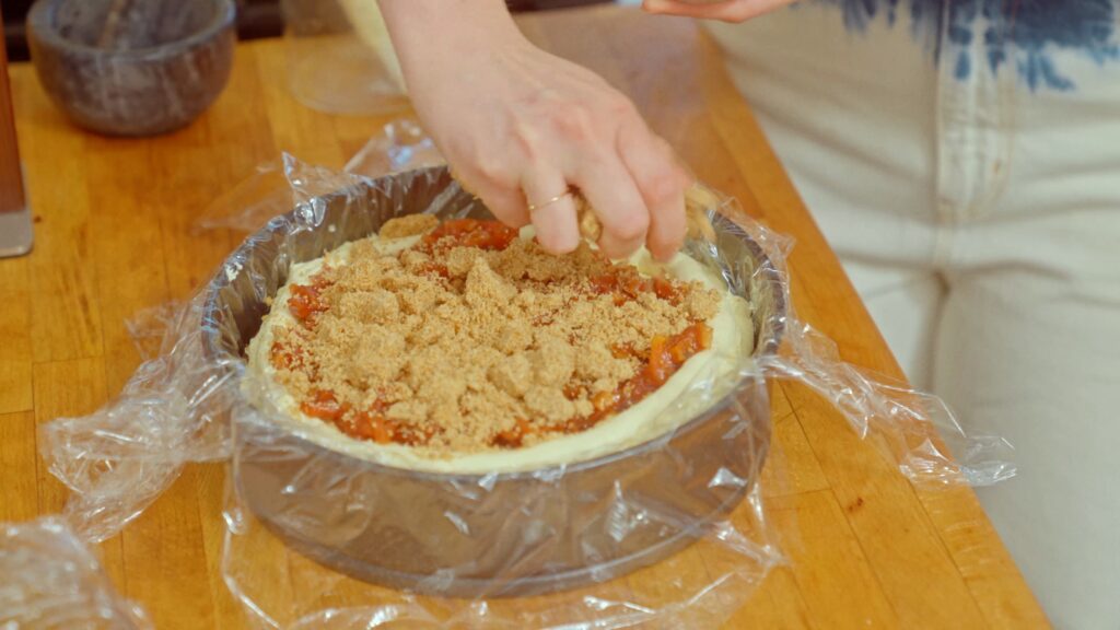Spoon half the pineapple cinnamon marmalade into the center of the ring, smoothing it out to the edges of the ring. Then sprinkle on half of the graham cracker almond crumble—don’t be shy. It adds crunch, so you need a liberal layer!