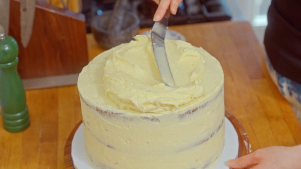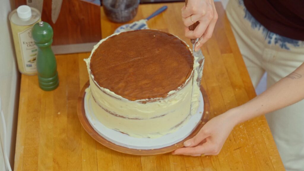 Tip: If you want ultra-clean edges, especially for wedding-style cakes, go slow and switch between an angled spatula and a bench scraper for the sides while rotating the cake.