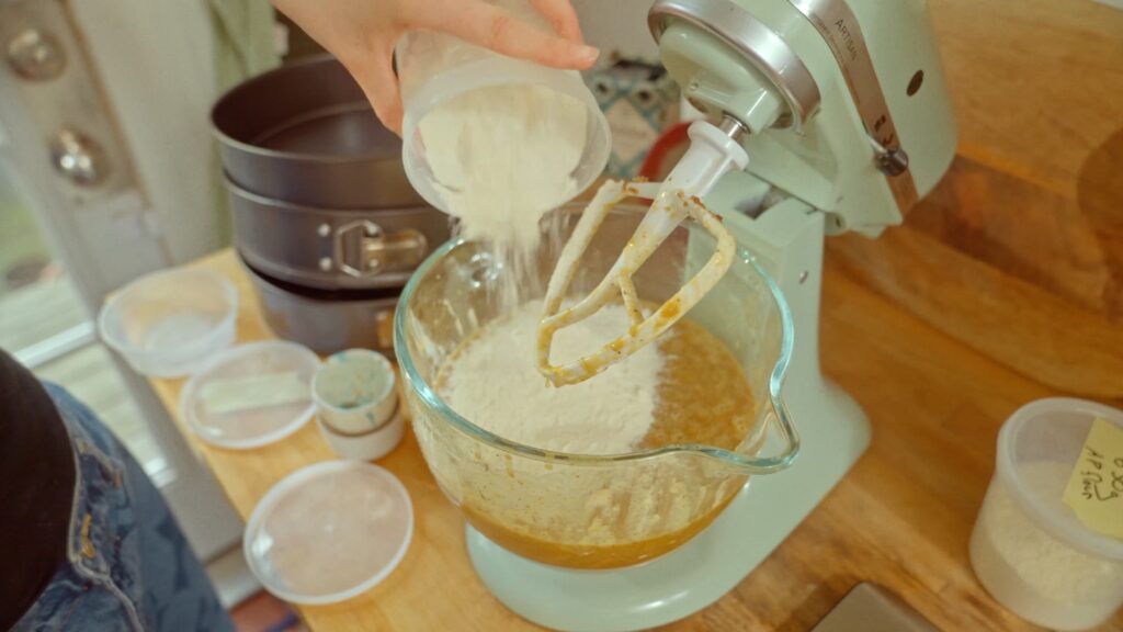- Next, add 630 grams of all-purpose flour, 2 teaspoons baking powder, 2 teaspoons baking soda, and 2 1/2 teaspoons kosher salt. Mix on low until a batter forms.