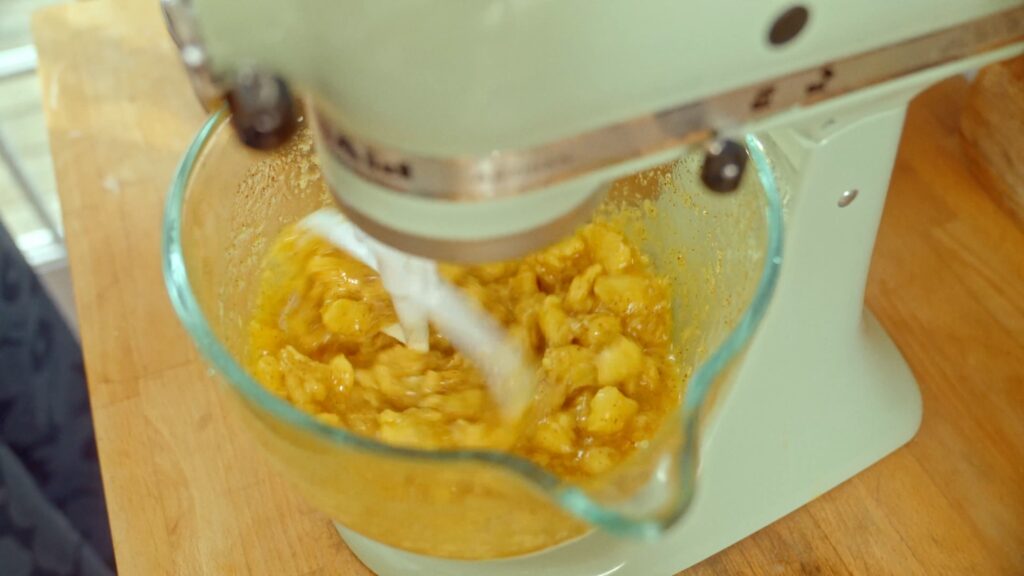 - Add 900 grams of bananas into the bowl with the brown butter. Using the paddle attachment, mix on low speed to mash the bananas into the brown butter. Stop when the mixture has chunks but is nearly smooth.