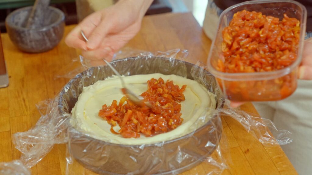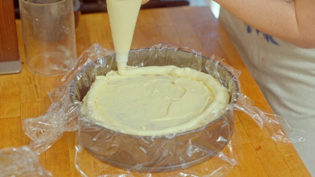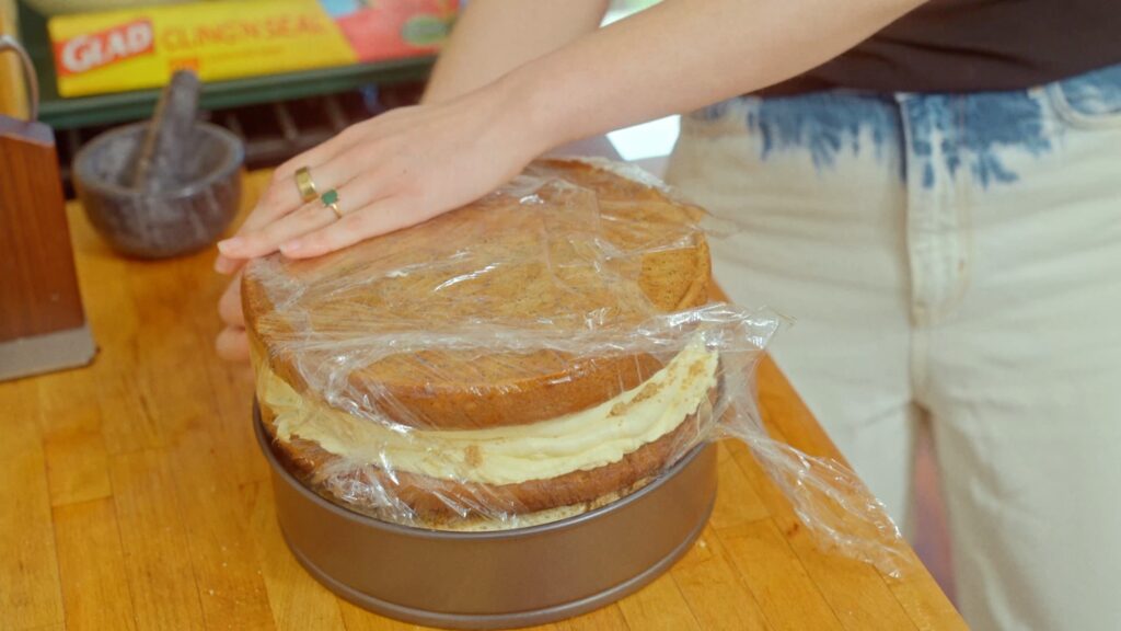 Line the inside of a clean 10-inch springform pan with two long pieces of cling wrap, crisscrossing them so you have a good amount hanging over the sides. This will help you seal up the cake later for storage.