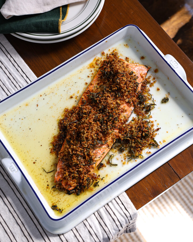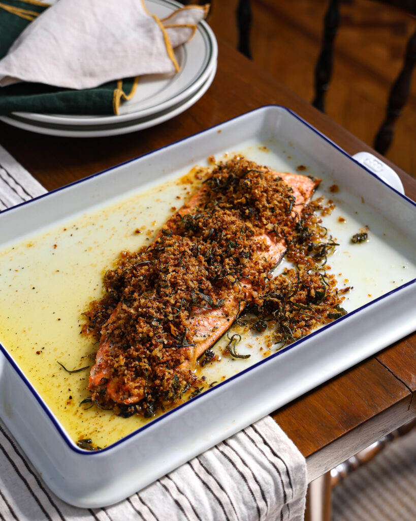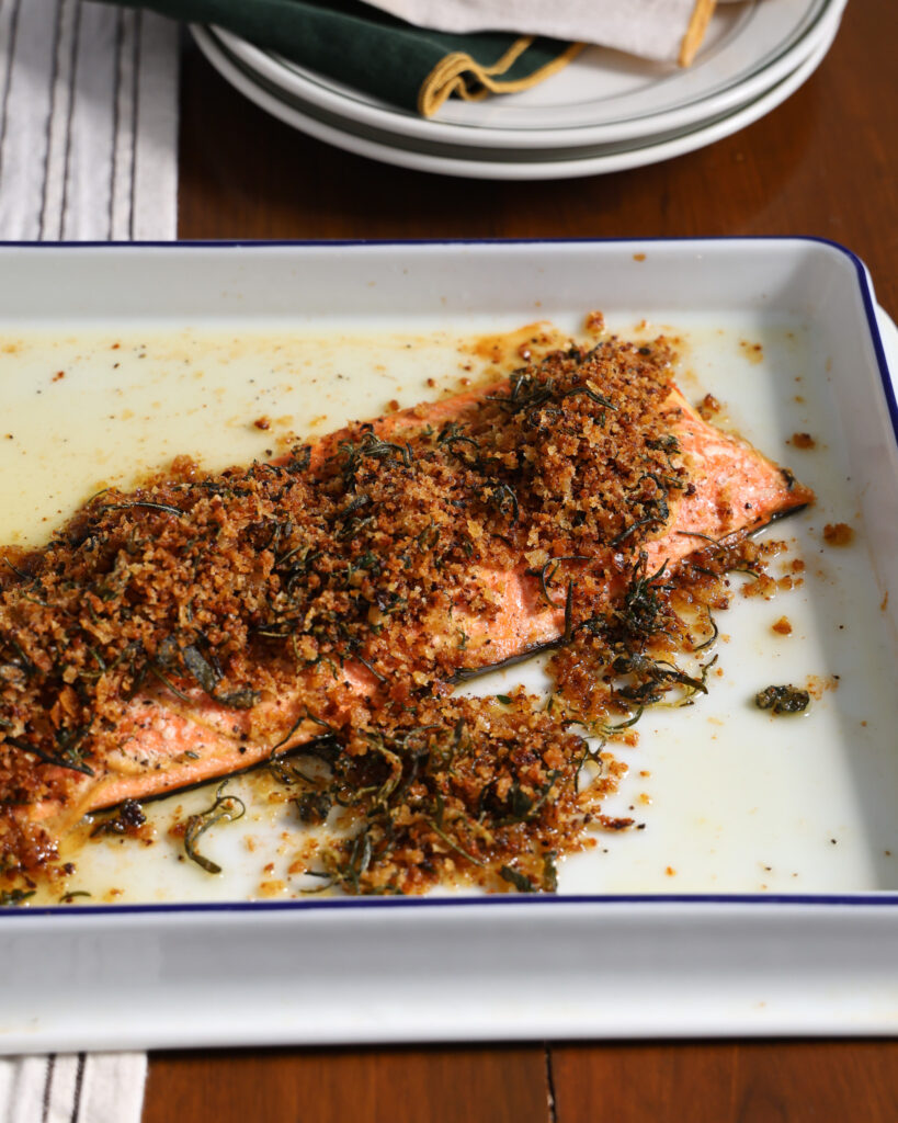 - When the salmon is finished, scatter the breadcrumbs over the top. Serve with a big spoon so guests can flake the salmon away from the skin as they like.