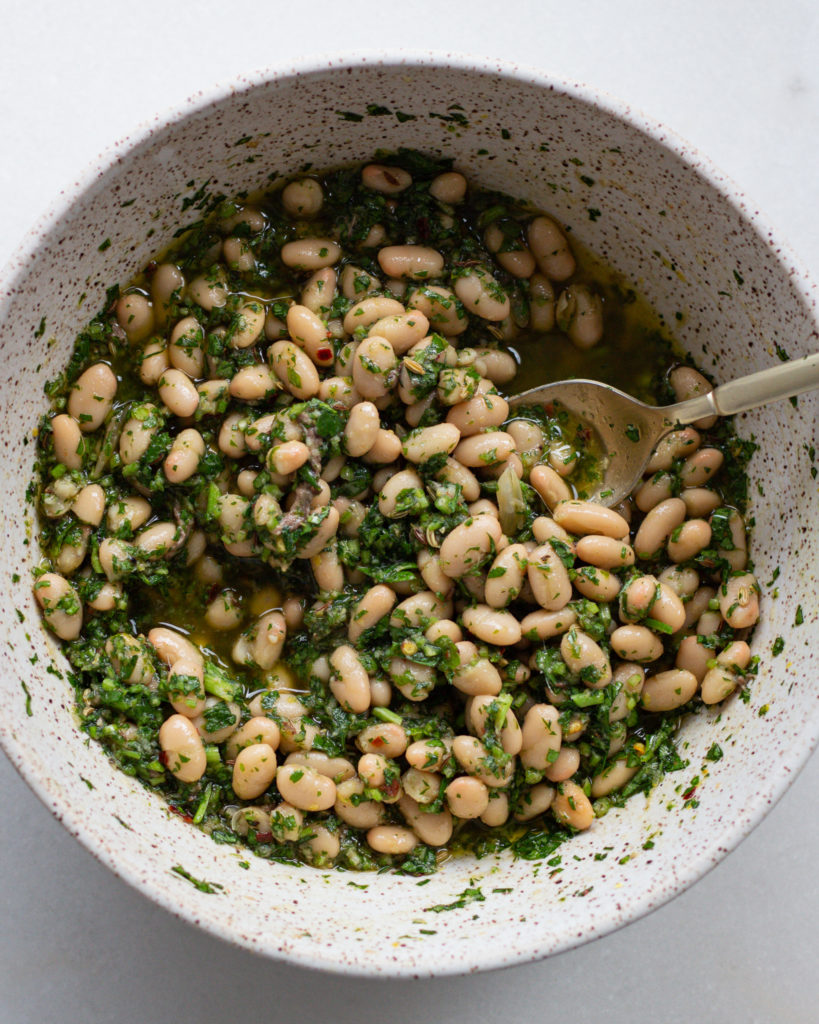 These anchovy beans are simultaneously my easiest, but also classiest bean recipe. And I know that’s hard to believe, especially if you’ve made my chimichurri beans or my butter bean salad, but it’s true. These anchovy beans are rich, comforting, incredibly filling, bold with flavor, but require no “cooking” cooking. You just need to heat up some olive oil on the stove, pour it over your ingredients, then mix and serve.