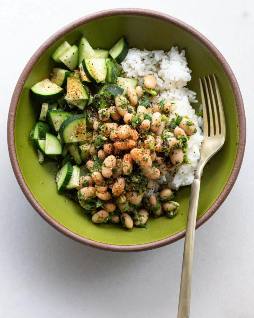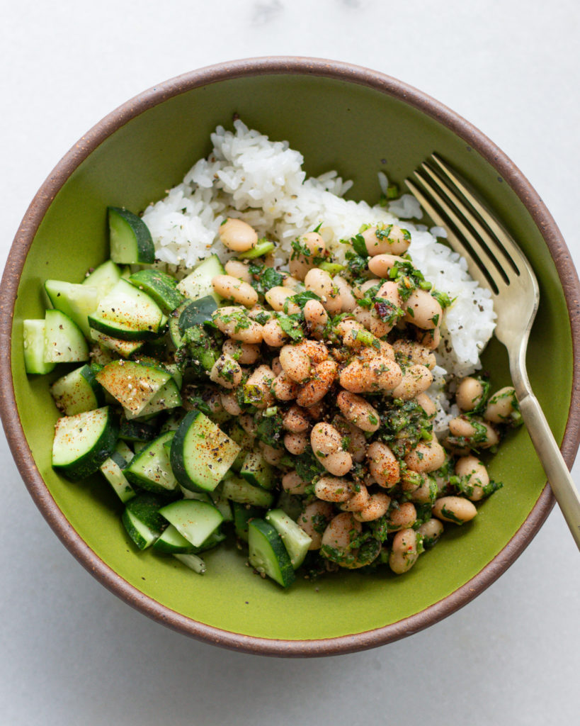 - To serve, add a portion of rice to each bowl, then add the chopped cucumbers, and top with the beans. Drizzle any remaining anchovy oil on top. Garnish black pepper, paprika and any leftover parsley!