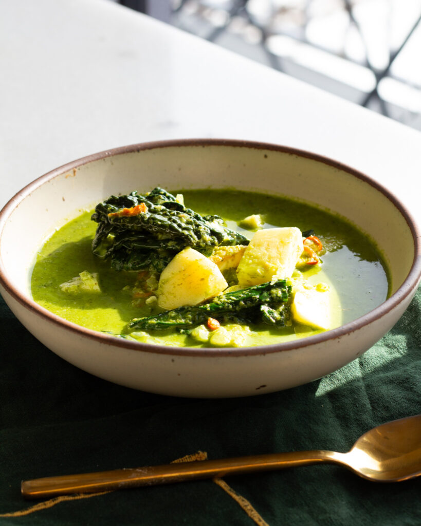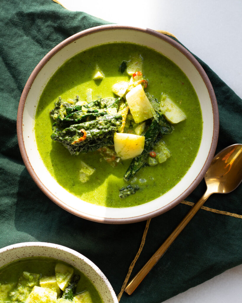 This soup is loaded with cruciferous vegetables like broccoli, plant-based proteins such as crispy tofu and edamame, and micronutrients from spinach and cilantro, all made creamy with coconut milk. It’s the kind of feel good green soup that feels like a necessity.