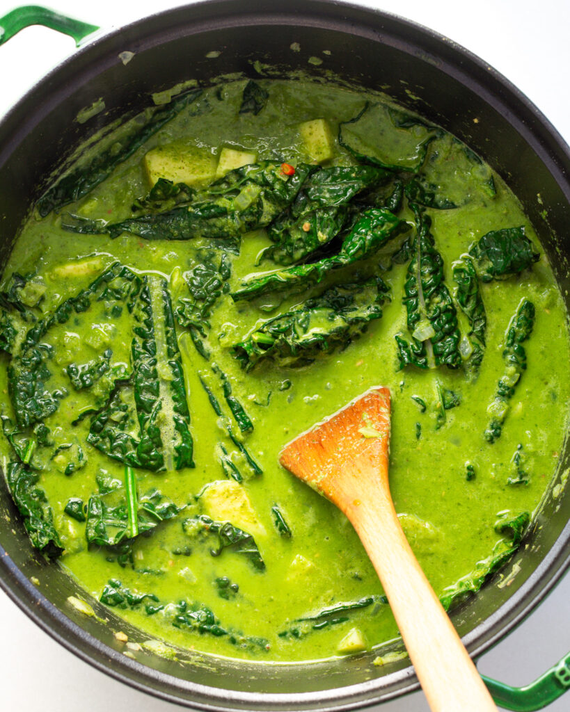 - Pour in the coconut broth and two additional cups of water. Let this come to a simmer and simmer for 15 minutes or until the potatoes are fork-tender. Add the kale, stir and let the soup cook for another 2-3 minutes or until the greens have wilted in. Remove the lime peel from the soup and squeeze in the juice from the lime. Taste and season with salt as needed.
