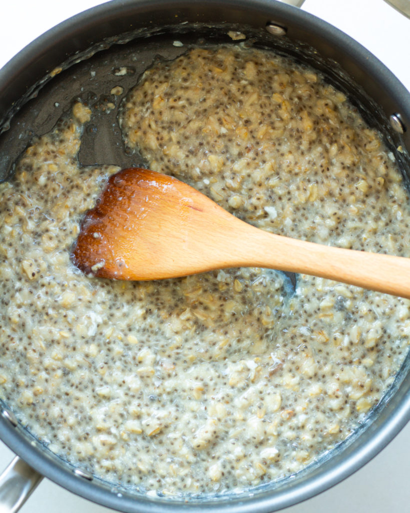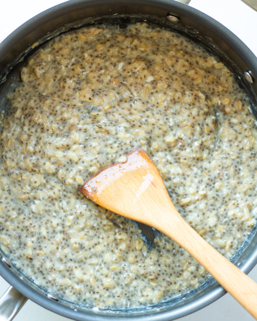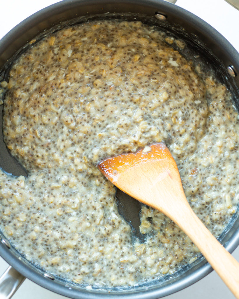 - Using the same pan, add the oats, chia seeds and the remainder of the water. Bring this mixture to a very low simmer. Let the oats simmer for 4-5 minutes or until thick, and then turn off the heat.