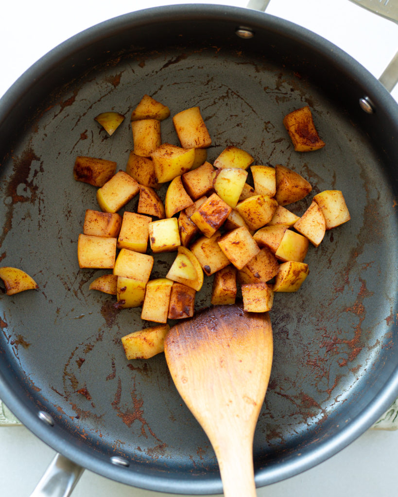 Cooking an apple on the stove top is easy, the key is to use a gentle enough heat to let the apple release its own moisture and soften slightly.