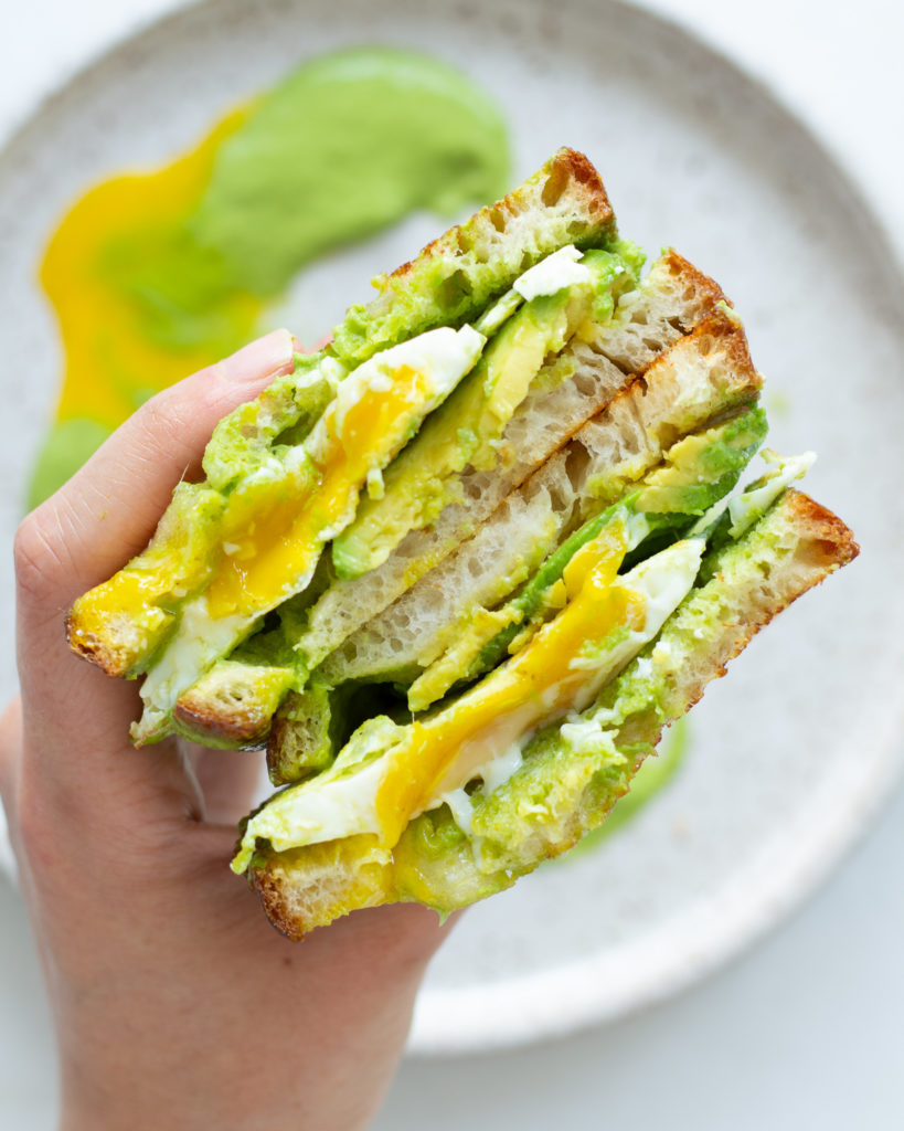 This recipe is my go-to avocado egg breakfast sandwich. It’s filling, it’s quick, it’s easy, and most importantly – it’s packed with flavor. Who needs a store-bought hot sauce when you can smother yours in a homemade green skhug? See what I’m saying? You get me 😉