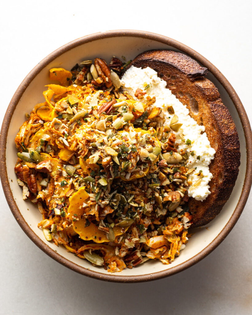 To serve, pile the salad on top of a toasted piece of sourdough with a thick smear of ricotta. Add the roasted pepitas topping and serve!