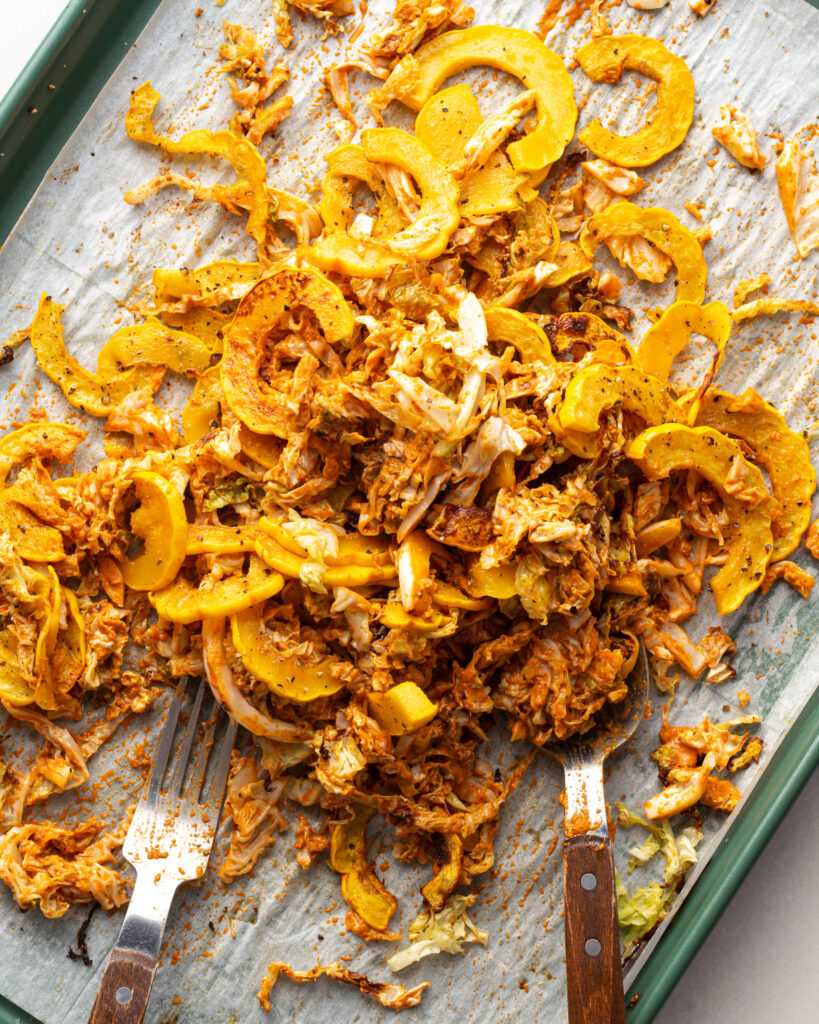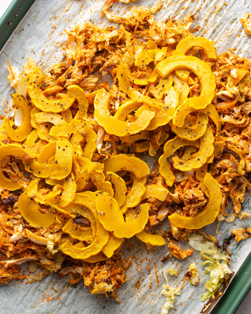 Roast the cabbage and the squash in the oven for 20-25 minutes, or until some cabbage pieces are browned and crisp and the squash is roasted and browning on the bottom!