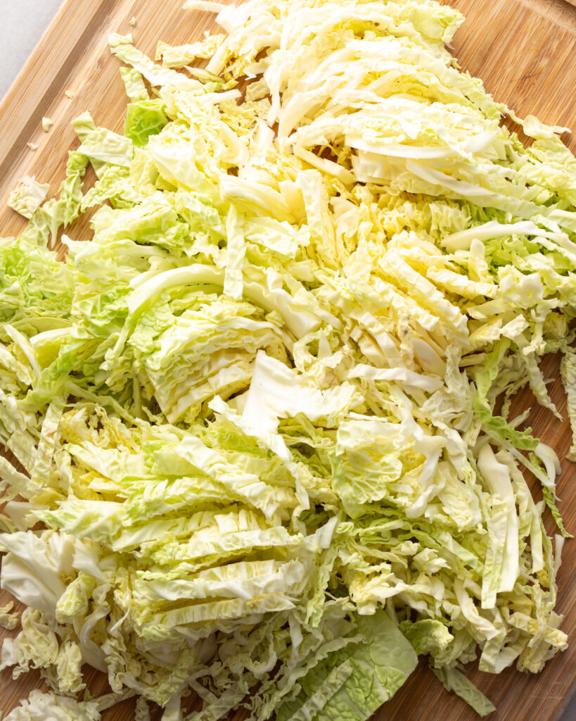 So set the oven to 400°F. Then remove the core from the cabbage and thinly slice it. Scatter on a parchment-lined baking sheet. Drizzle with about a teaspoon of olive oil, and season with a small amount of salt and pepper.
