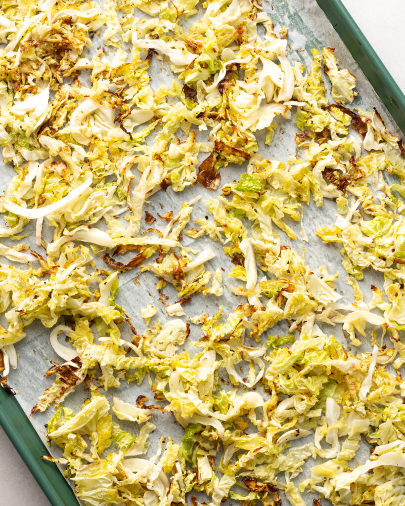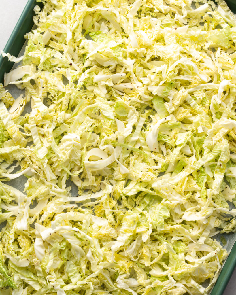 - Remove the core from the cabbage and thinly slice it. Scatter on a parchment-lined baking sheet. Drizzle with about a teaspoon of olive oil, and season with a small amount of salt and pepper.