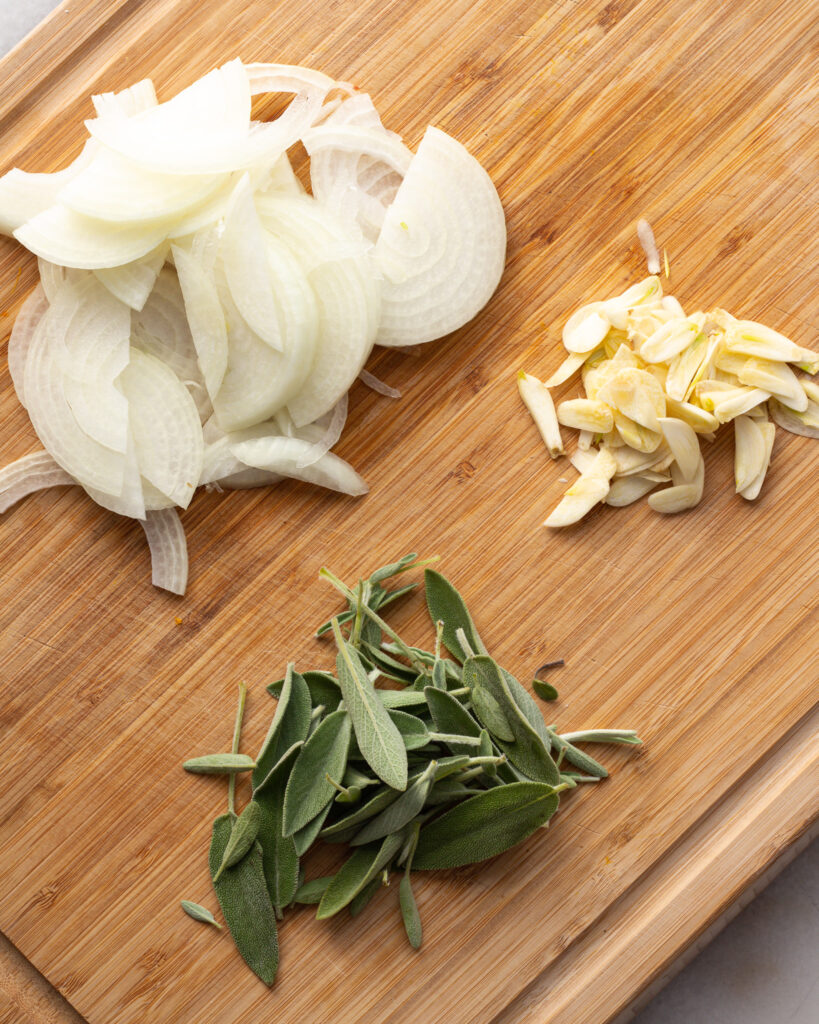 - While the vegetables are roasting, thinly slice the onion and the garlic cloves. Remove the sage leaves from their stems and set aside.