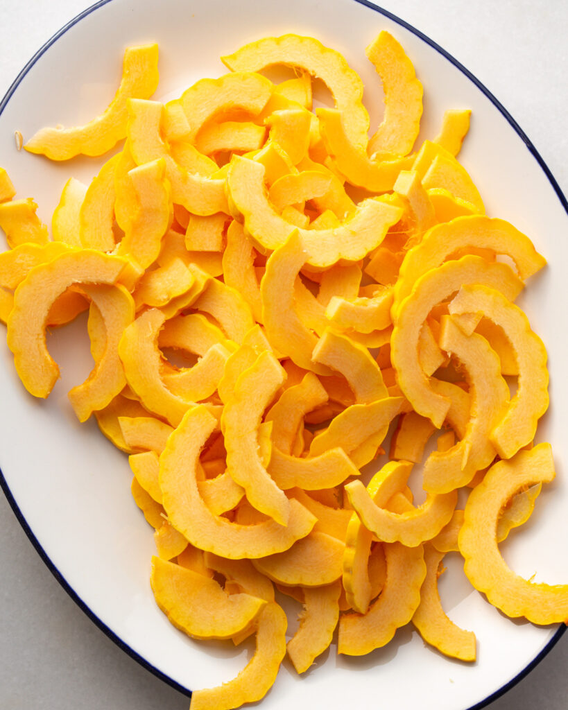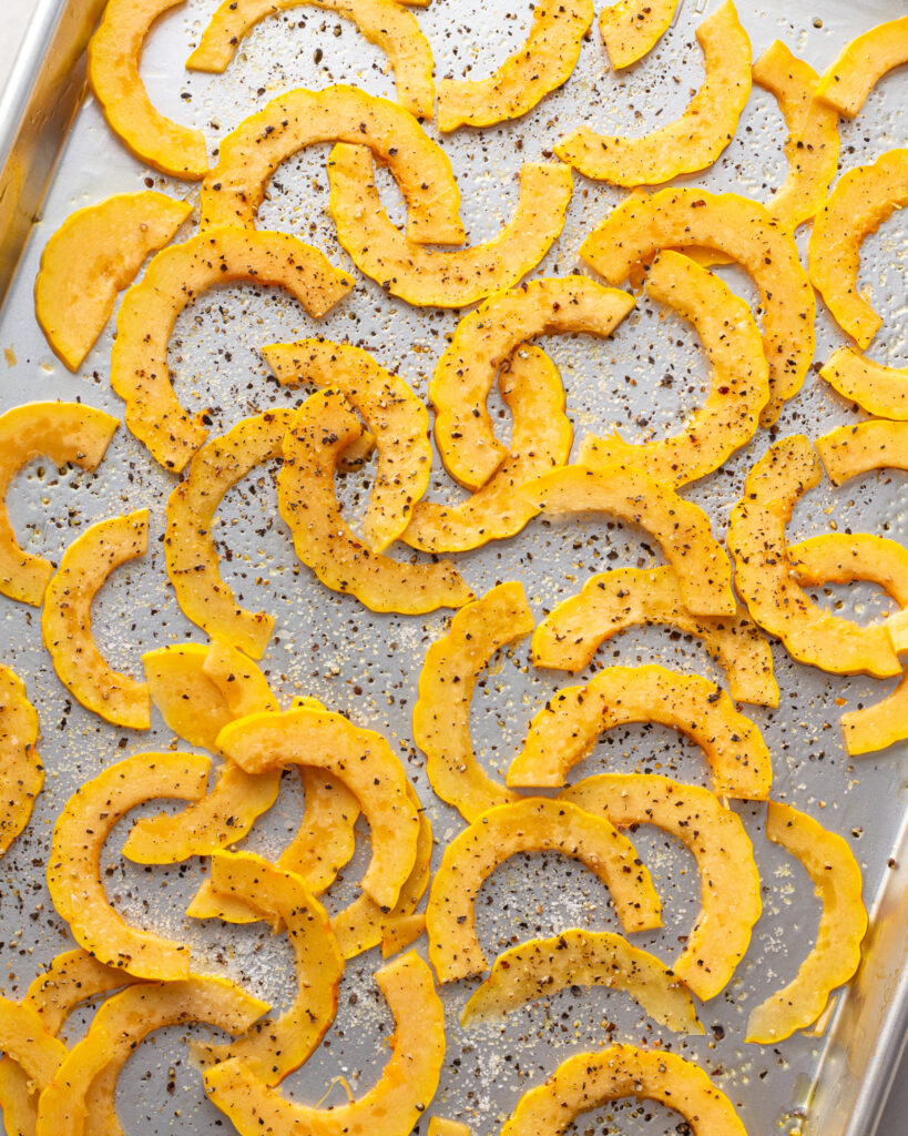 - Cut the delicata squash in half and remove the seeds. Thinly slice into half-moon pieces. Scatter on an unlined baking sheet and toss with salt and pepper.