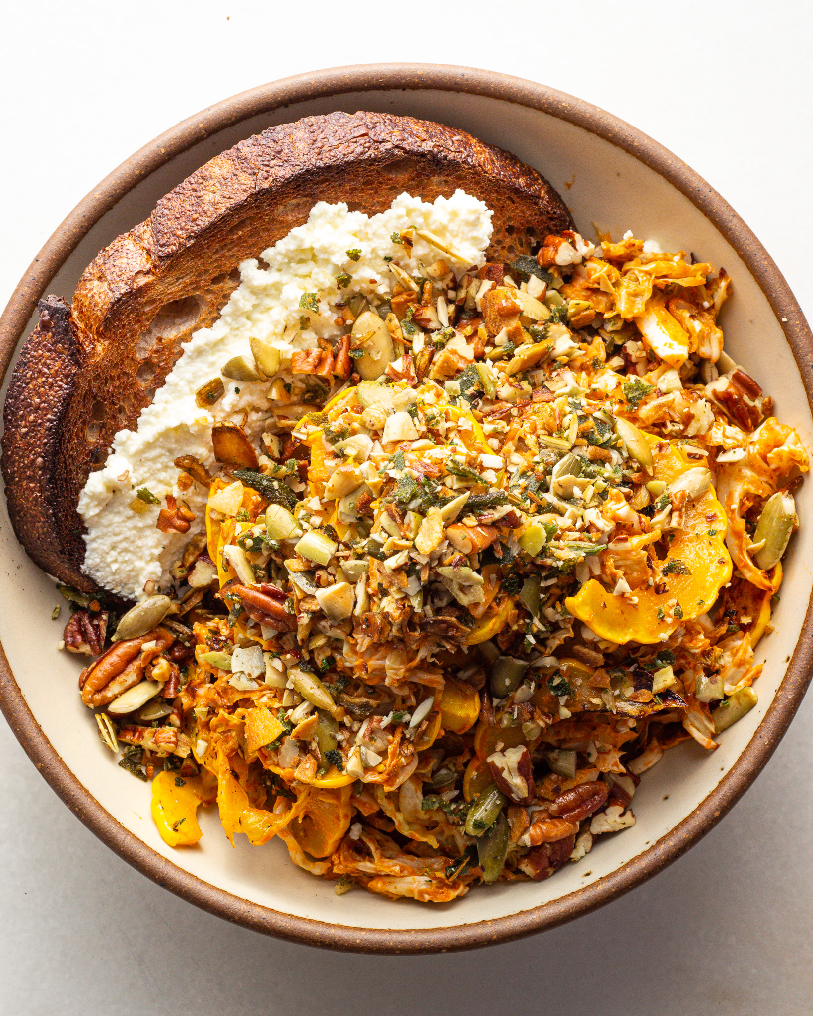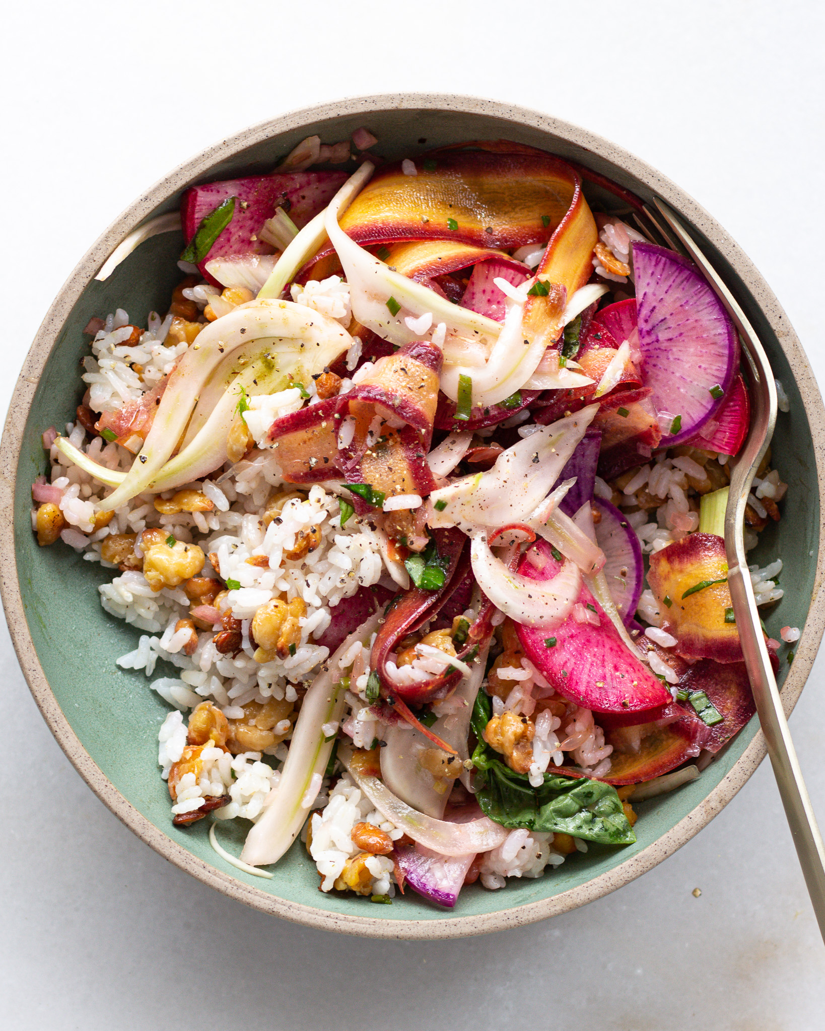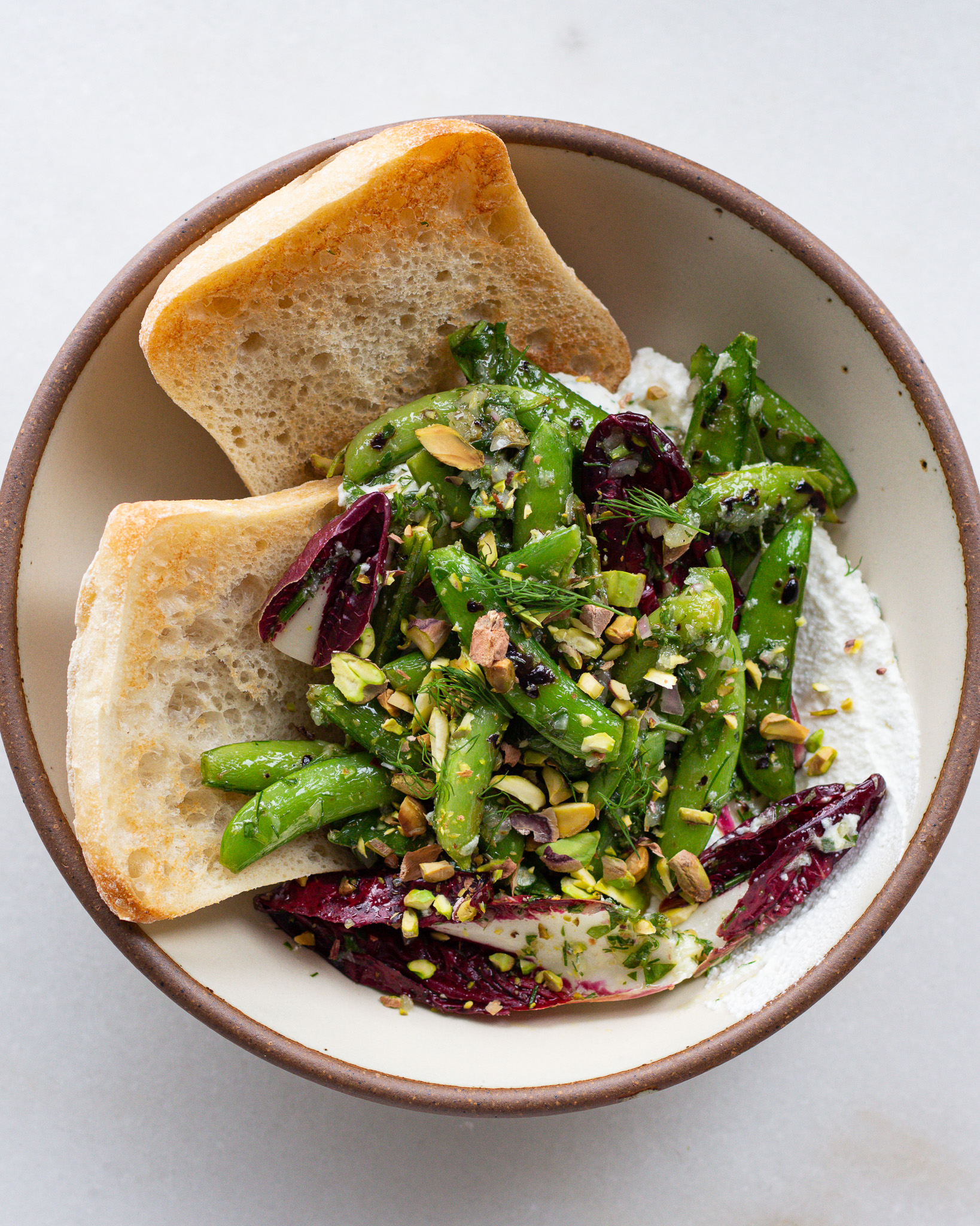 First things first: grab a large bowl. To it, add in the sliced peas, radishes, basil, mint, dates, and feta. Toss these ingredients to combine and then add a squeeze of lemon juice, the sumac, and a large pinch of salt. Once our raw ingredients are mingling, drizzle with a bit of olive oil and taste. Add lemon juice and salt to your taste, then set this salad aside until you’re ready to eat.