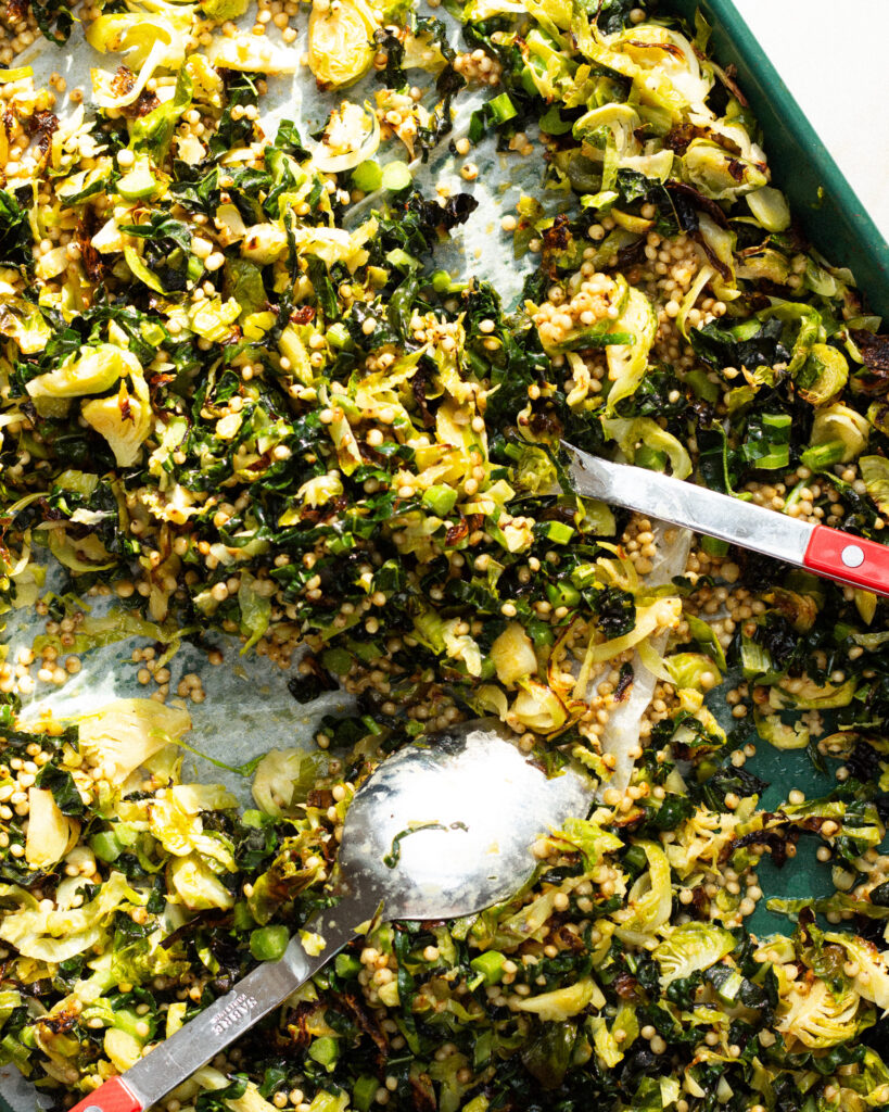 So I recommend you crowd your pan – just a little! It allows the Brussels sprouts to soften while still gaining color on the edges, and it lets the kale wilt into a very delicious texture. Plus…it saves you a few pans!