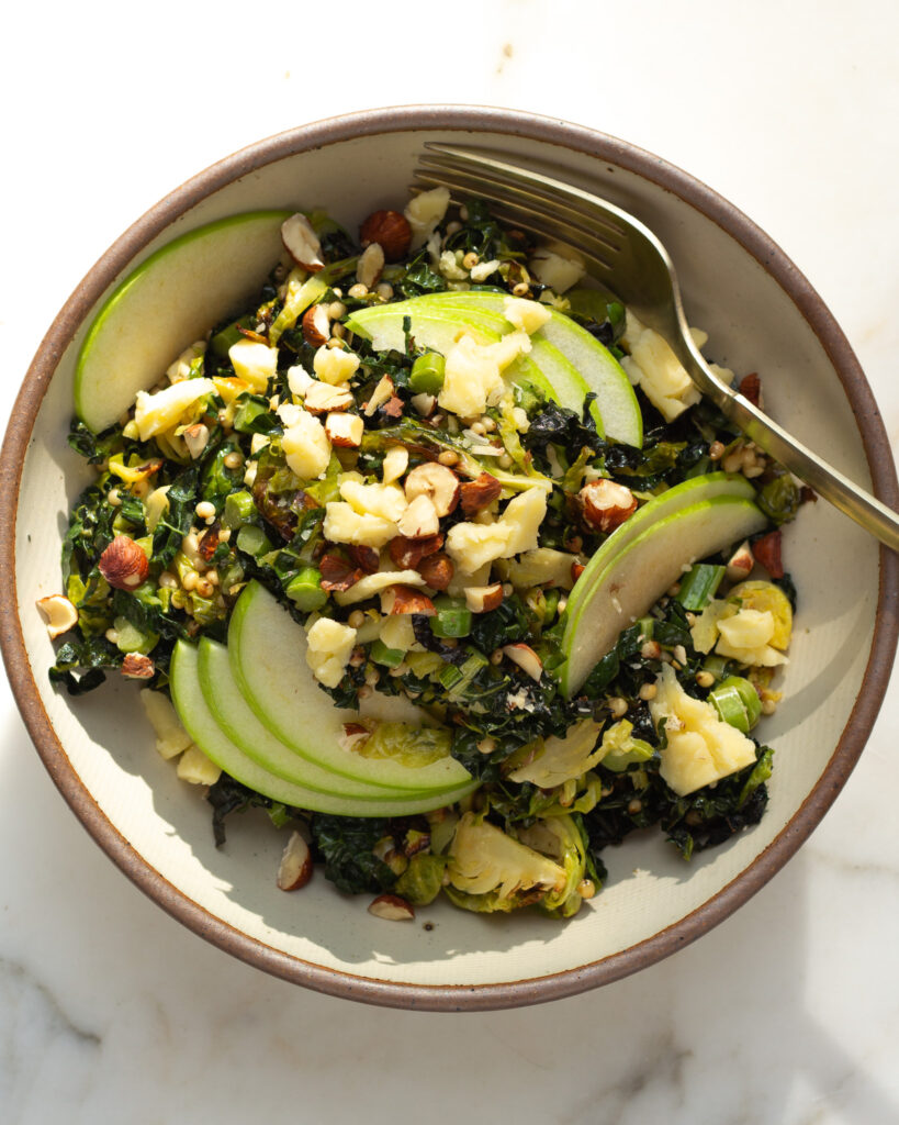 This salad is one of my favorite varieties – BAKED SALAD. And yes, that’s definitely a salad style I included in my cookbook. Baked Salad is a style of vegetable bowl that I’ve been obsessing over (and finessing!) since 2020. And yes, to keep it simple, it is leafy greens…that are baked. But there’s a fun dressing involved! And toppings! Honestly, what’s not to love? So I’m excited to give you another rendition of salads with this Baked Kale Salad with Brussels Sprouts, Honey Mustard and Green Apple!