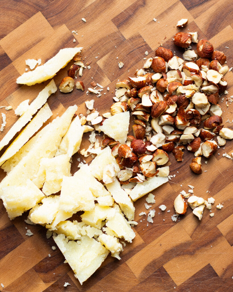 - Roughly chop 1/2 cup of hazelnuts. Transfer them to a pan over medium heat and toast for 3-4 minutes or until fragrant.
