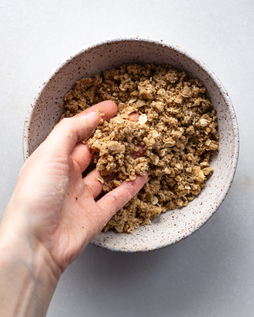 - Prepare the crumble topping. In a separate small bowl, add 3 tablespoons of chilled butter and 52 grams of flour. Toss to coat the butter in flour, then add 30 grams of dark brown sugar and 25 grams of rolled oats. Work the butter into pieces with your hands, consistently tossing to coat in the flour and sugar. You're looking to make a crumb-like texture, with pieces no bigger than the tip of a pencil eraser. Set this in the fridge while you prep the rest of the recipe.