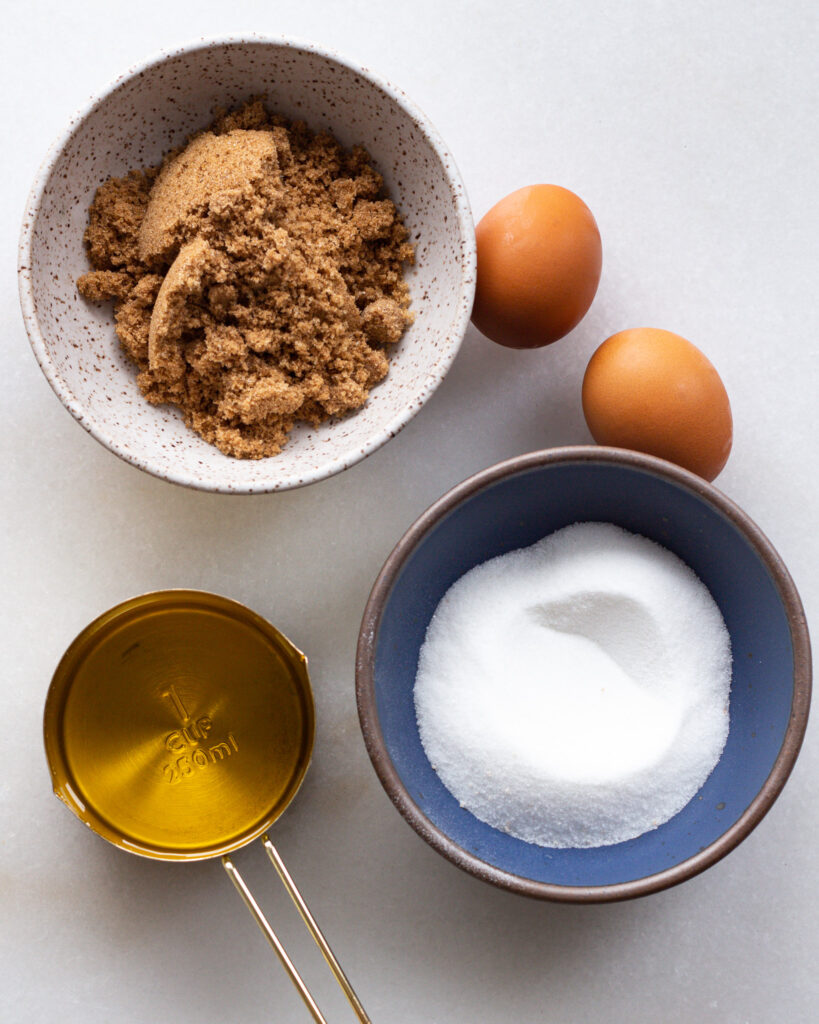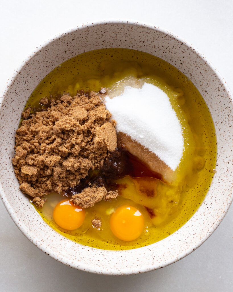 - In a large bowl, mash the 3 bananas well. Add 2 eggs and mix to combine. Add 1 tablespoon of vanilla extract, 120 grams of olive oil, 80 grams of dark brown sugar, 110 grams of granulated sugar, and 130 grams of Greek yogurt or skyr. Mix well.