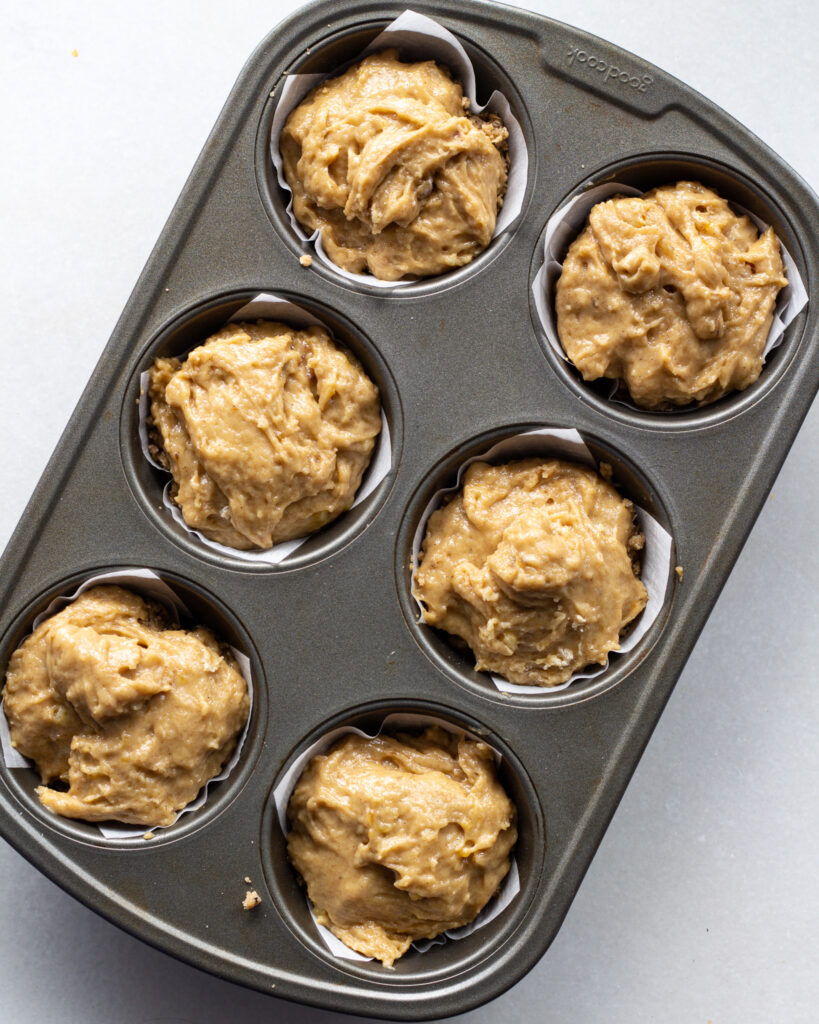 Add the dry ingredients to the wet in batches, and mix to combine. You’ll have a thick, delicious banana batter in seconds. Try not to eat it all while you prep the rest of the recipe 😉