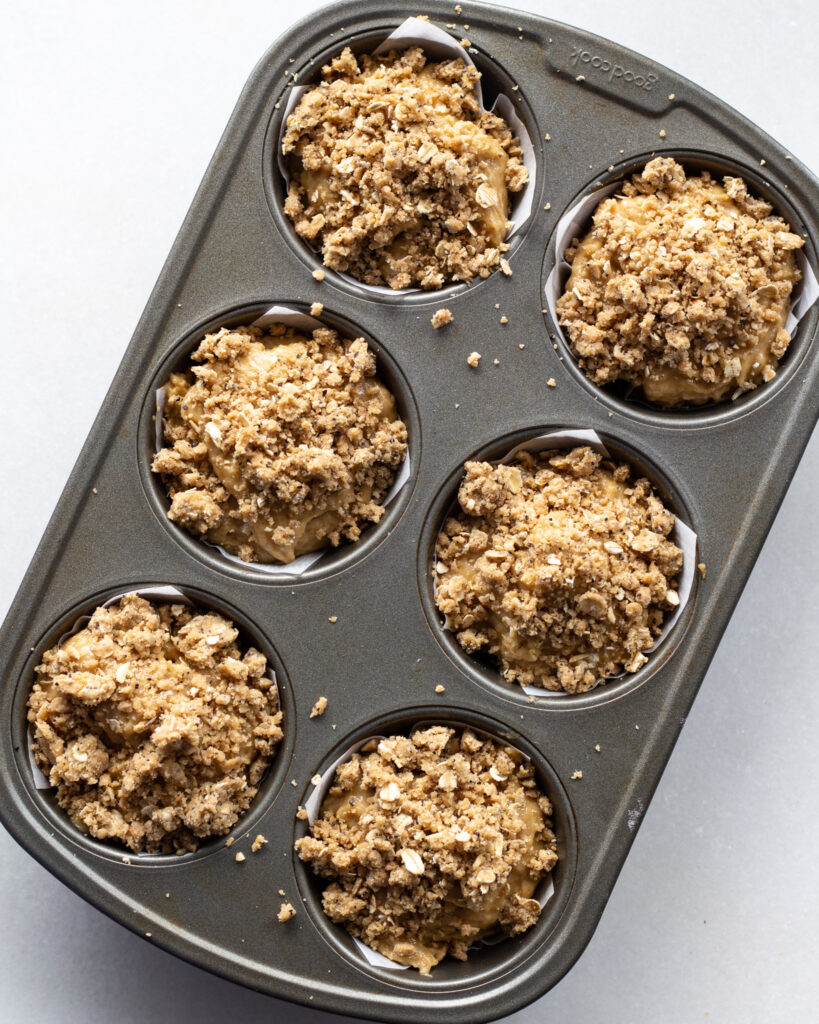 - Add a small amount of batter to each cup, then sprinkle in about 1 & 1/2 teaspoons of sugar mixture. Layer more batter on top until the muffin tin is about 3/4 of the way full. Add a generous layer of the crumble topping.