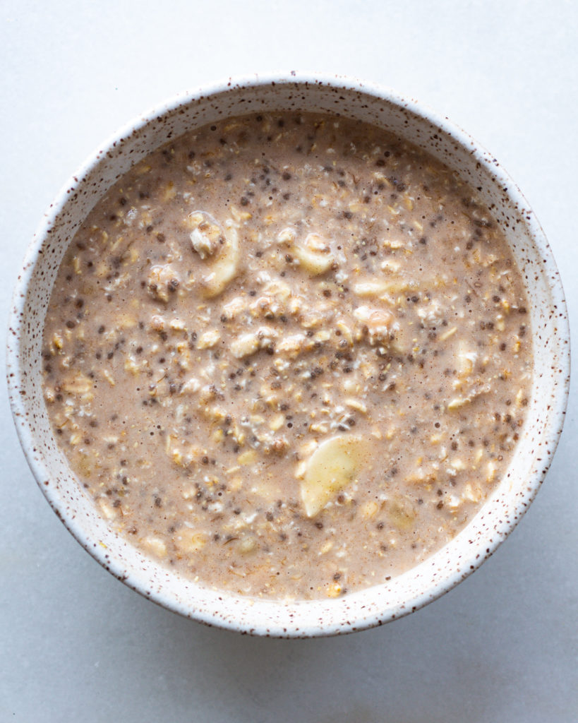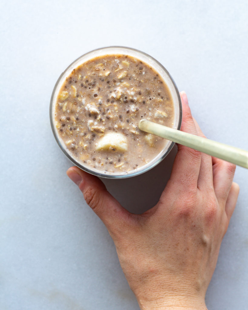 - Add the banana, oats, plant milk and chia seeds (protein powder as well if you are using it!) into your overnight oats container. Stir and set this in the fridge to chill.