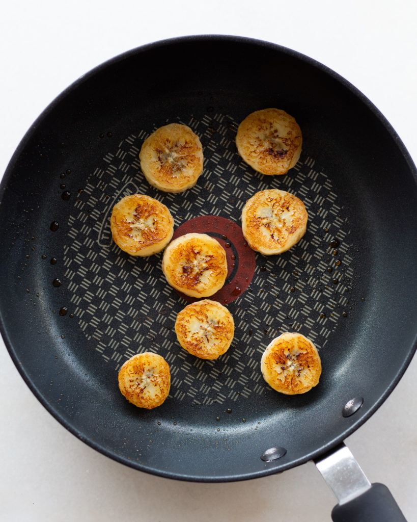 - When you are ready to eat, slice the second half of the banana. Set a skillet to medium high heat and add the coconut oil. Grill the bananas for two minutes on each side, or until they are slightly golden brown.