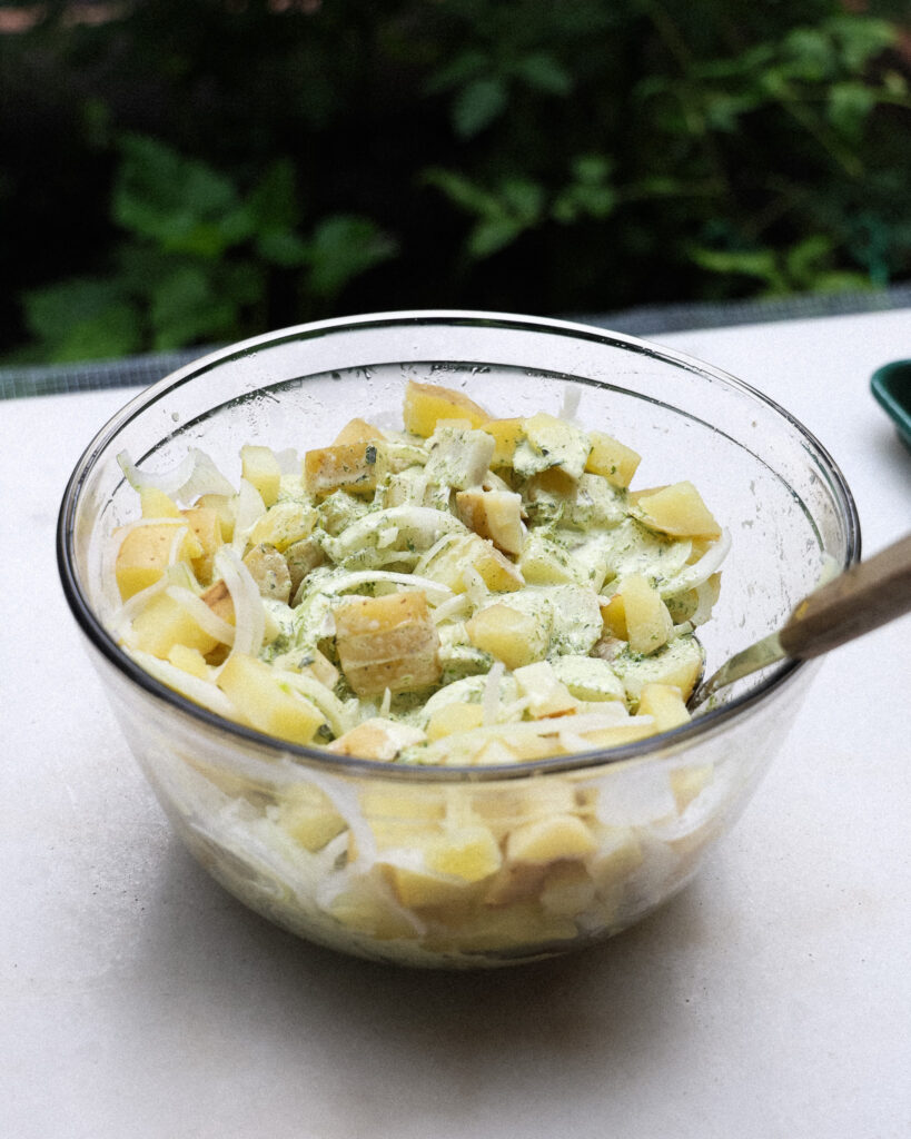 - Don’t use the potatoes when they are still warm – you need them completely cool. Otherwise you risk your basil dressing darkening, and your mixing getting a little gluey.