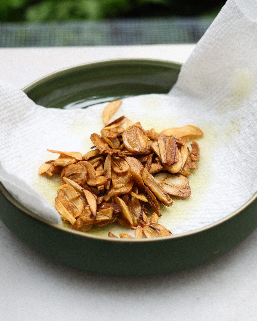 - Thinly slice 10 garlic cloves. Place a small sauté pan over medium heat and add 3 tablespoons of olive oil. When the oil is hot enough that you can add a garlic slice and it immediately sizzles, add all the garlic slices. Swirl so they are an even layer on the bottom of the pan. Simmer for 1-2 minutes or until the slices are turning golden. Then use a slotted spoon to transfer the crispy garlic to a paper towel to drain. Season with a pinch of salt. Leave the remaining oil in the pan to use in the basil dressing.