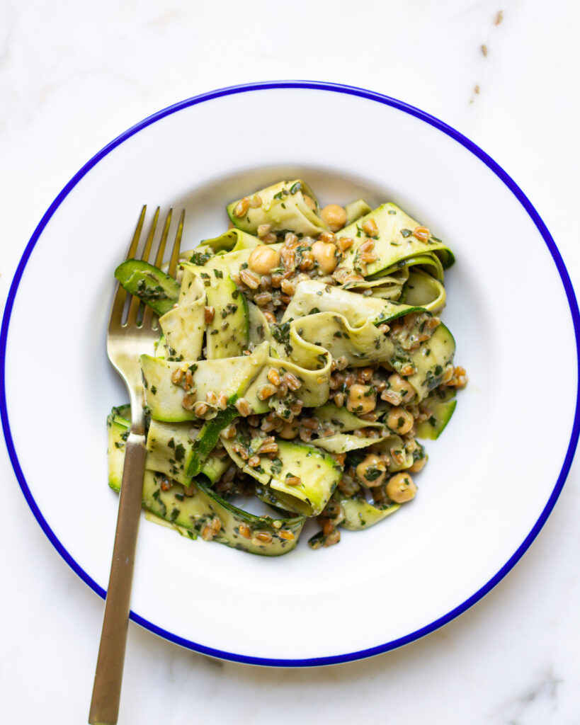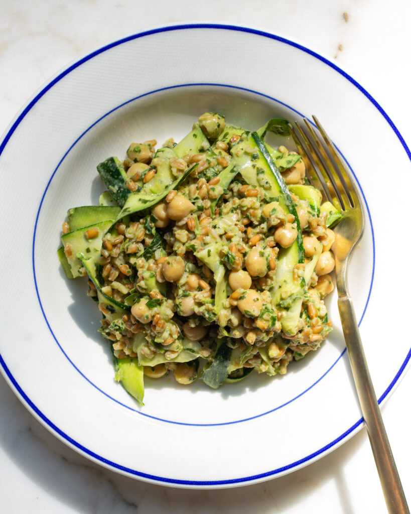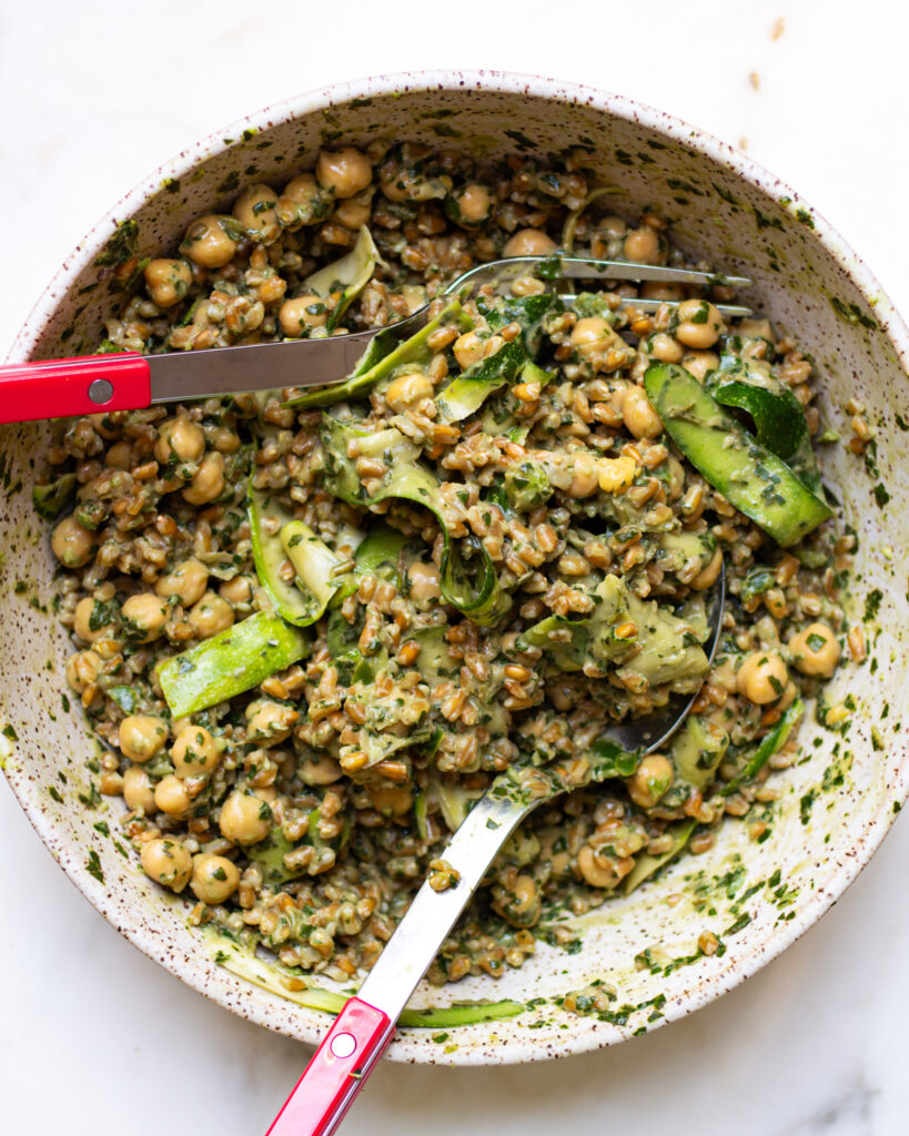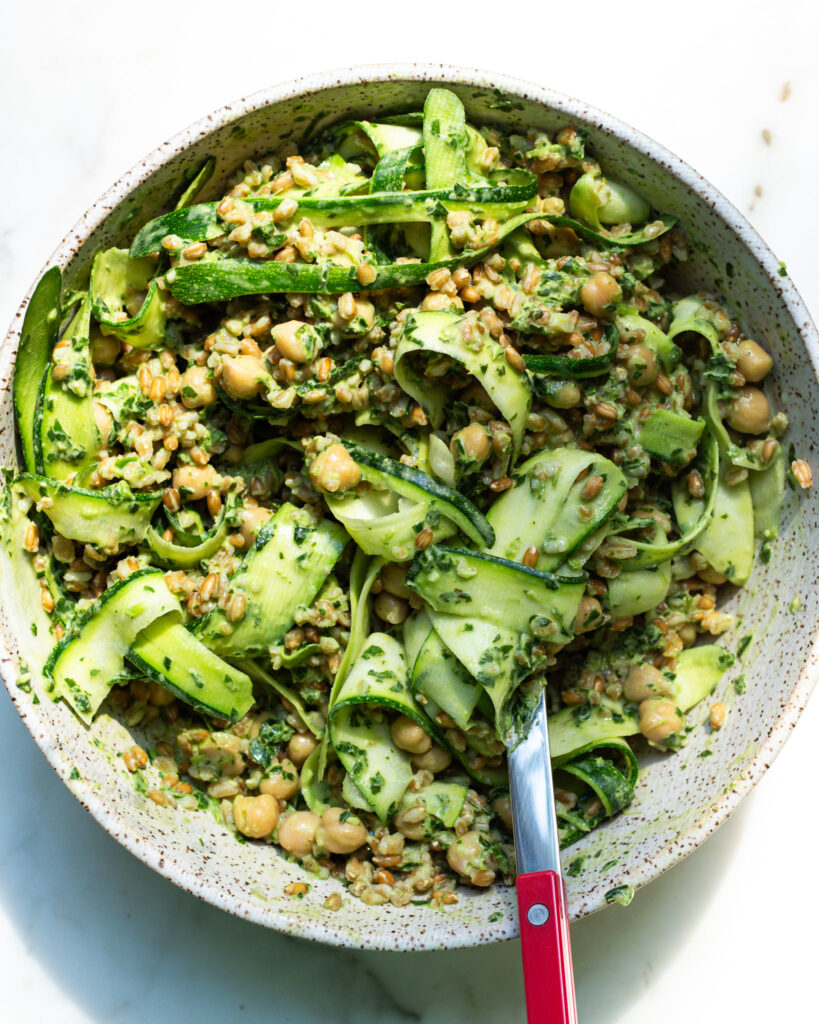 - Pour the basil tahini dressing into a large bowl. Add the chickpeas and farro. Use a vegetable peeler to peel in long strands of zucchini, rotating around the seeds so that no seedy pieces are added (those tend to fall apart and be a bit mealy). Toss everything to combine.