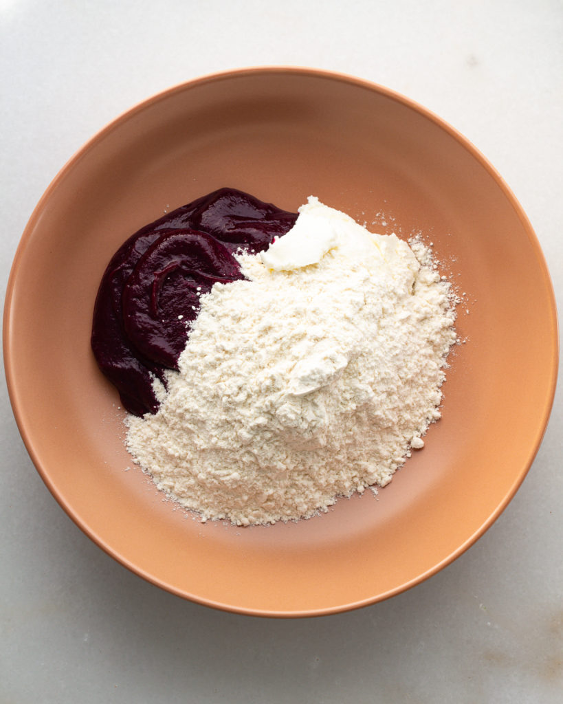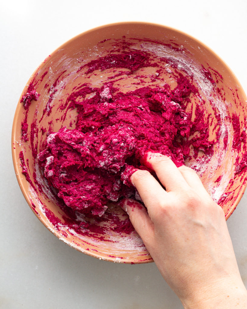 - In a bowl, combine the beet purée, the ricotta, the flour and the salt. Begin mixing with your hand until a rough, soft dough forms.