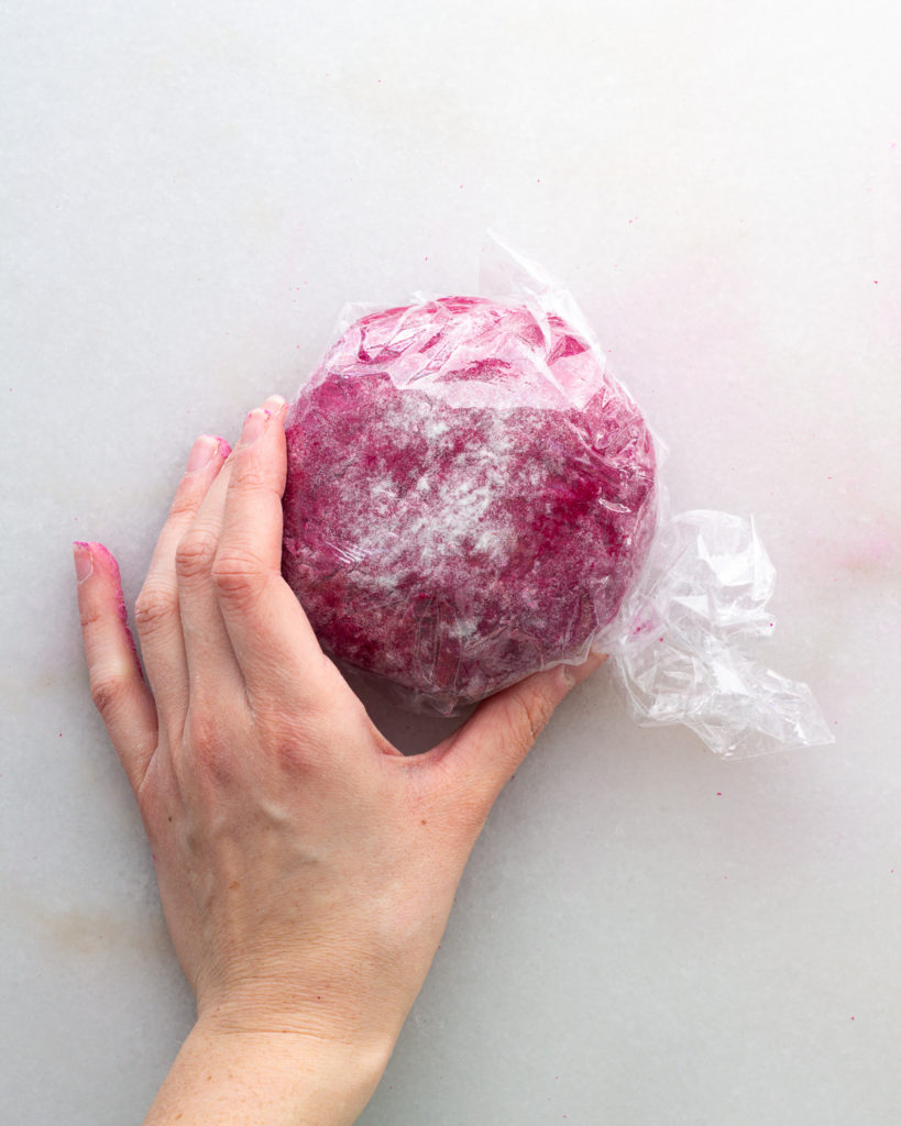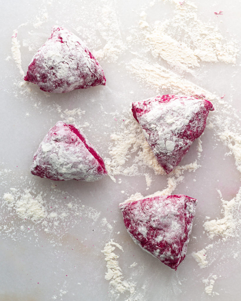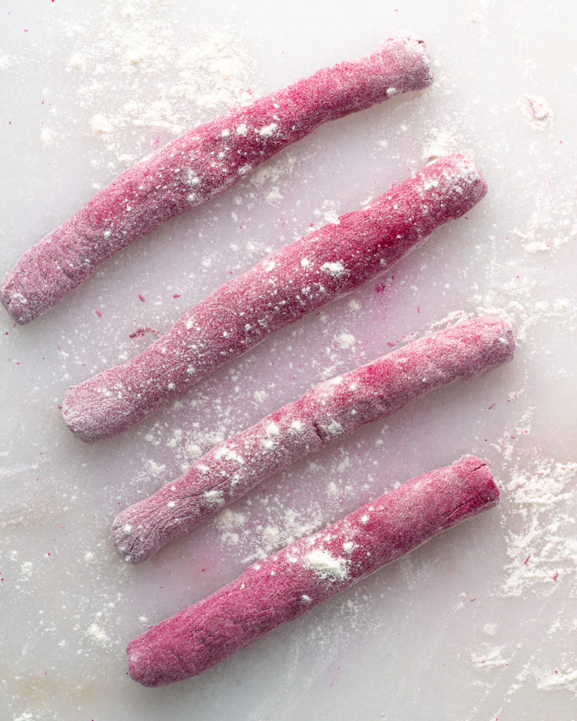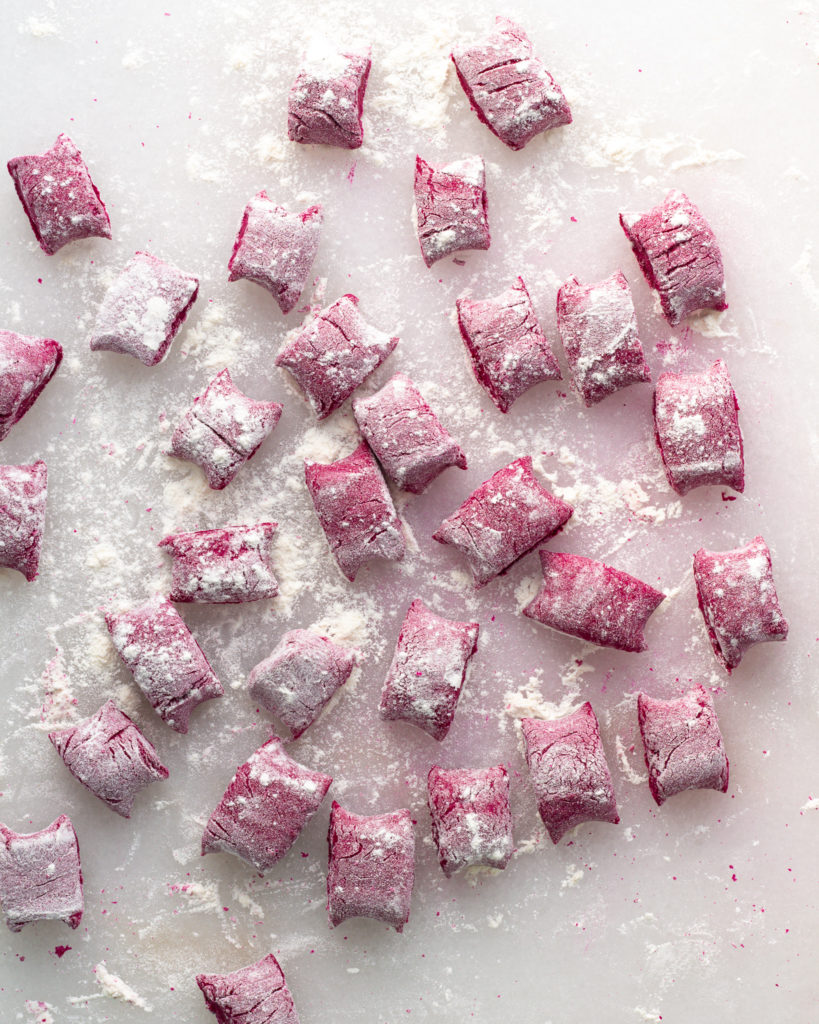 I’ve found the best way to shape gnocchi is to roll it into small, long tubes before cutting. Sometimes this gets tricky on a floured surface, especially with the beet ricotta gnocchi which is very tender. If you are having trouble rolling out the gnocchi, dust a little bit of flour OFF your work surface to help get some traction.