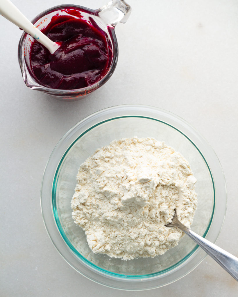 Unlike the original gnocchi recipes, we are completely omitting the potato and opting for puréed beets. This changes the texture and flavor of the gnocchi, and also changes the process slightly. But the results are worth it – we are left with bright pink, slightly sweet, delicious gnocchi that feel like little dumpling pillows.