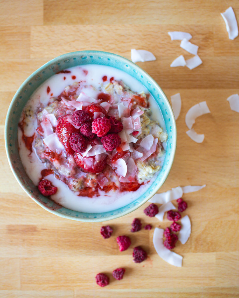 - Top the oats with the remaining berries, coconut flakes, the strawberry "juice" and then the dried raspberries.