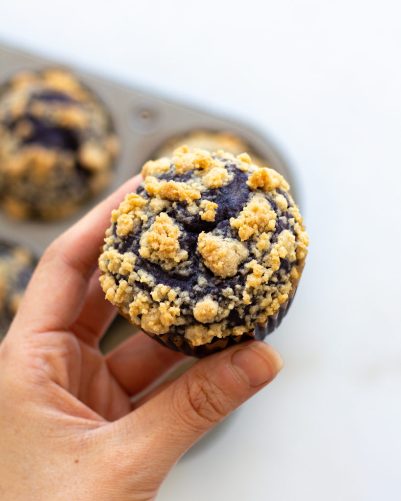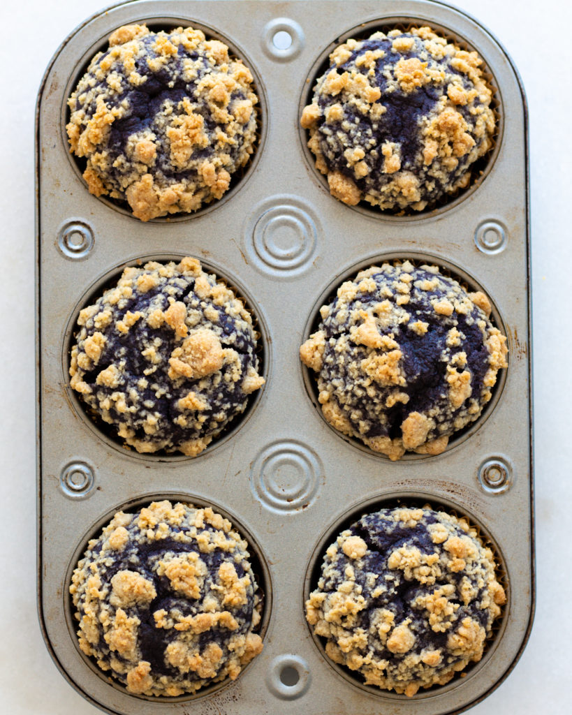 And the best part? Even with their blue hue, these are easy blueberry muffins. You just blend up the wet ingredients, fold into the dry and you’re good to go. Plus the rich, sugary golden streusel on top can’t be beat. I know I’m hyping these up, but, c’mon, I’m a proud mom.