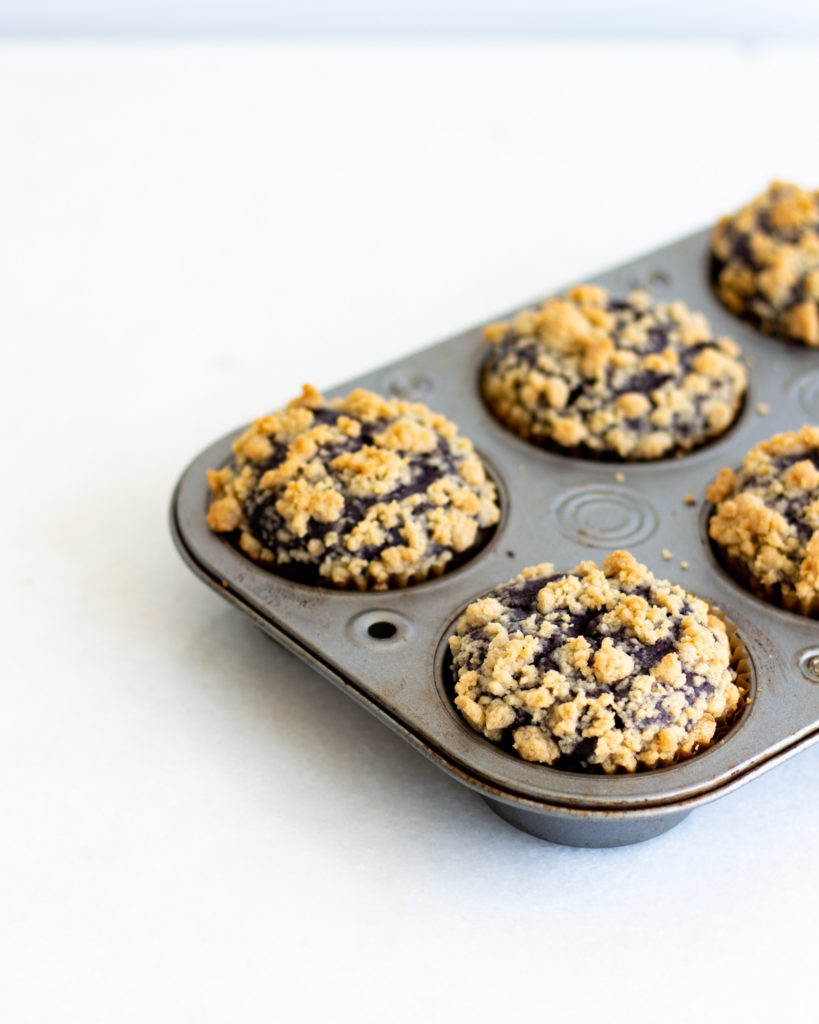 - In a muffin lined muffin tin, pour the batter until it is ¾ of the way up each muffin liner. Top with a generous amount of streusel.