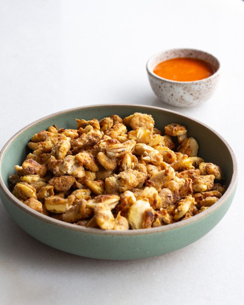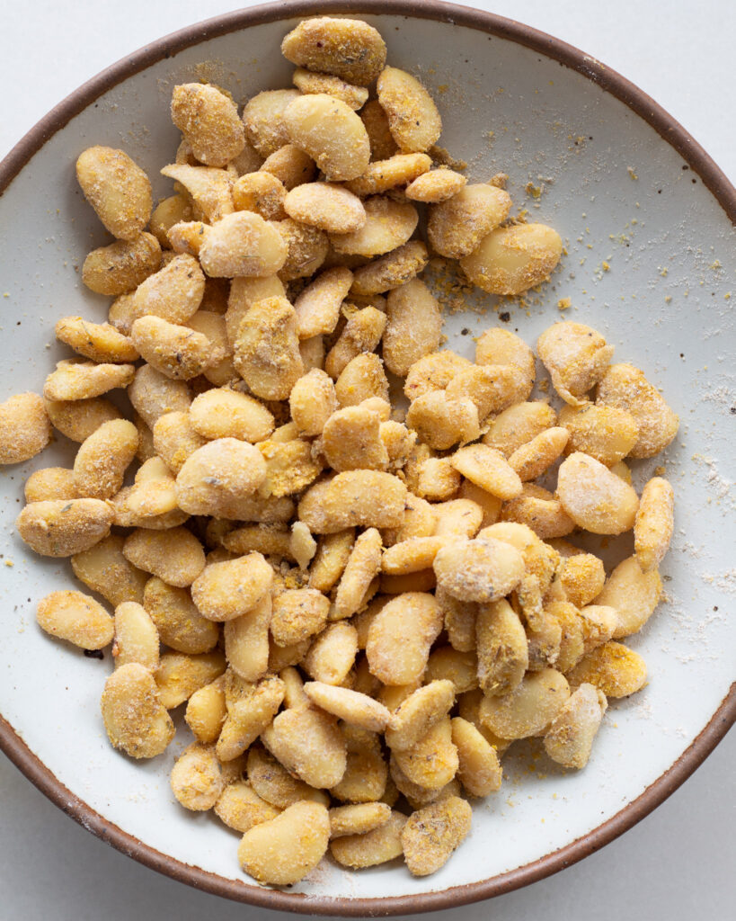 Breaded beans are funny in the way that you can (and should!) expect them to *poof* up a bit. As a bean cooks, it will dry out but then expand, causing some of the bean’s coating to poof into a crispy shell that is still intact, but might look a little removed from the bean. Don’t worry about this when it happens – it just means more salty, spicy, crunchy surface area for you to enjoy.