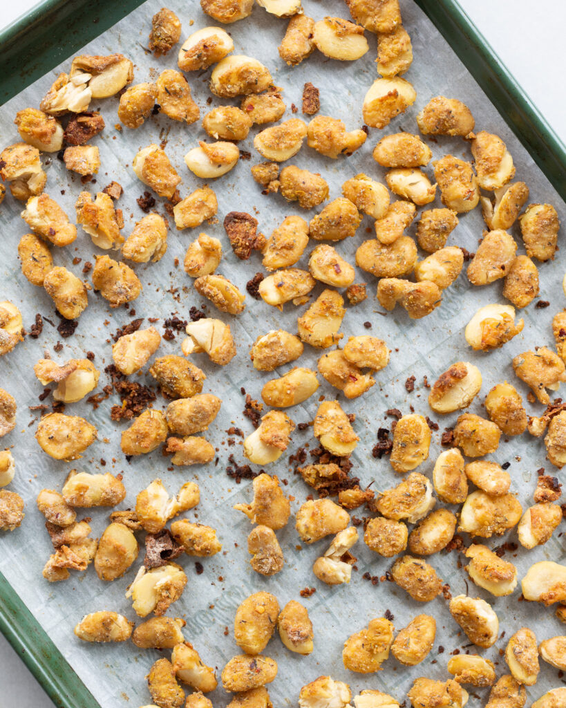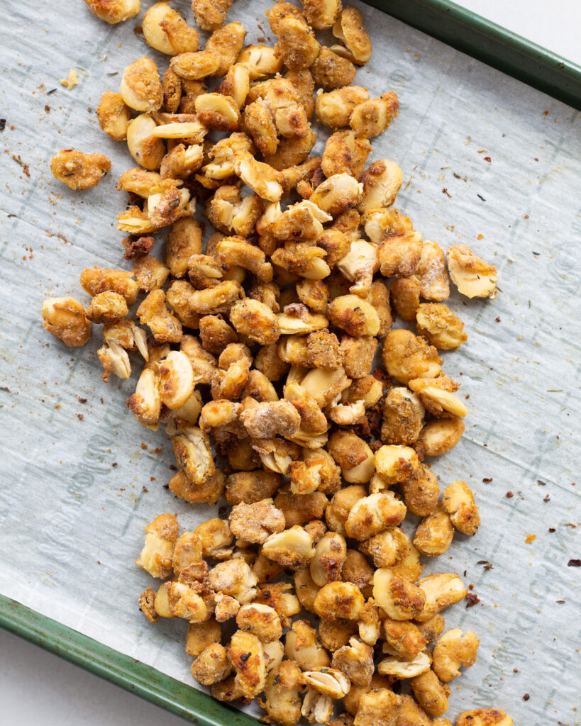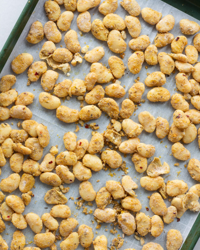 - Bake for 22-24 minutes or until the beans are golden and crisp. Some will have popped open, which is totally fine, it just gives you more crispy, crunchy texture!