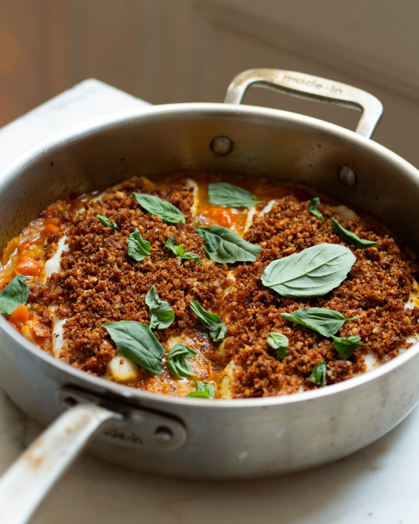 I like to put the same pan I’m using for the entire recipe over medium heat, add a glug of olive oil and a bit of the oil from the Calabrian chilies (they are stored in oil, which is what I’m referring to!) and toss in the bread crumbs. I toast these for a few minutes, or until they turn a deep, golden brown.