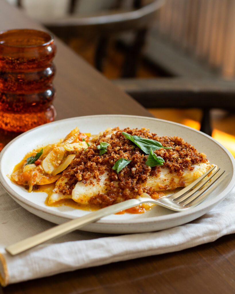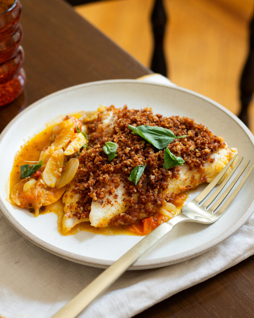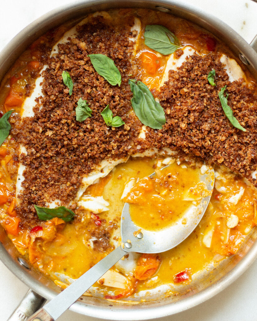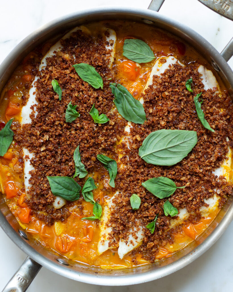 What makes this halibut recipe work so well is the process. You start by toasting your breadcrumbs in the pan until they are golden and crunchy. Then you transfer them out of the pan and use the same pan to cook down the aromatics and tomatoes into a jammy sauce. The halibut quickly steams on top, then you add back the breadcrumbs, and you’re done! What you’re left with is a fish that tastes like it was breaded and fried, but is nowhere close. For an easy, impressive meal, this one is one of my favorites.