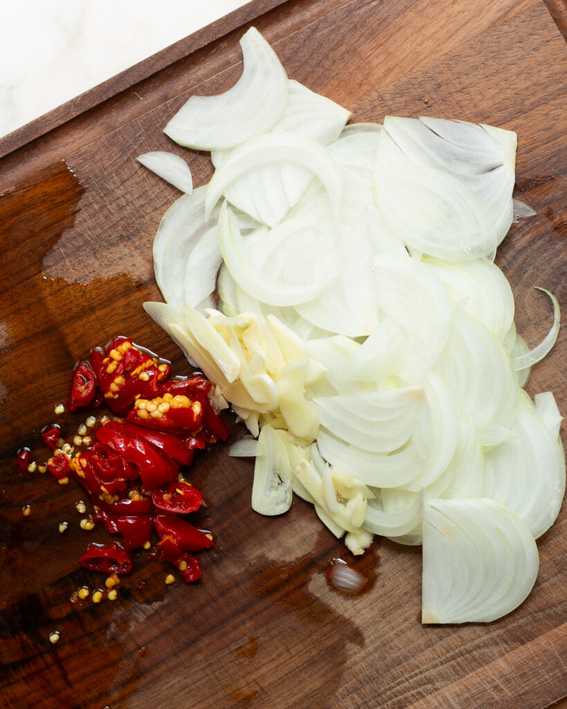 - Begin with your mise en place. Halve the three cups of tomatoes, peel and thinly slice two shallots, and thinly slice the four garlic cloves. Chop up three Calabrian chili peppers. Set all of this aside.