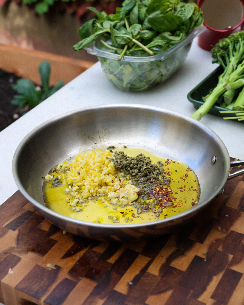 - Take 1/2 of the lemon and finely chop it, rind and all. Remove any seeds and add this to a medium sauté pan. Finely chop 2 tablespoons of capers and grate 3 garlic cloves and add these to the pan. Add 1/2 teaspoon of red chili flakes and pour in 1/4 cup of extra-virgin olive oil.