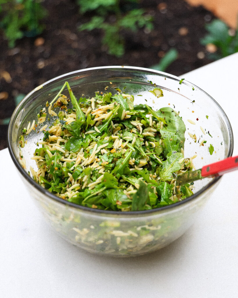 - Add the orzo to the large bowl. Tear in 2 cups of basil leaves and 4 cups of arugula and give everything a mix to coat in the dressing. Taste and season with more salt or lemon juice as preferred.