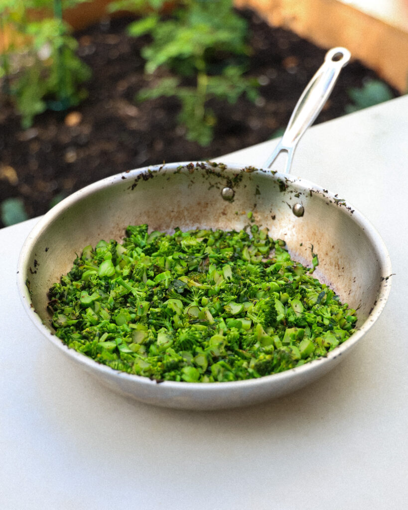 Same pan, no extra dishes. Cook until the broccolini is deep green and tender-crisp. Make sure to season it, we will need layers of seasoning as we continue to prep the salad.