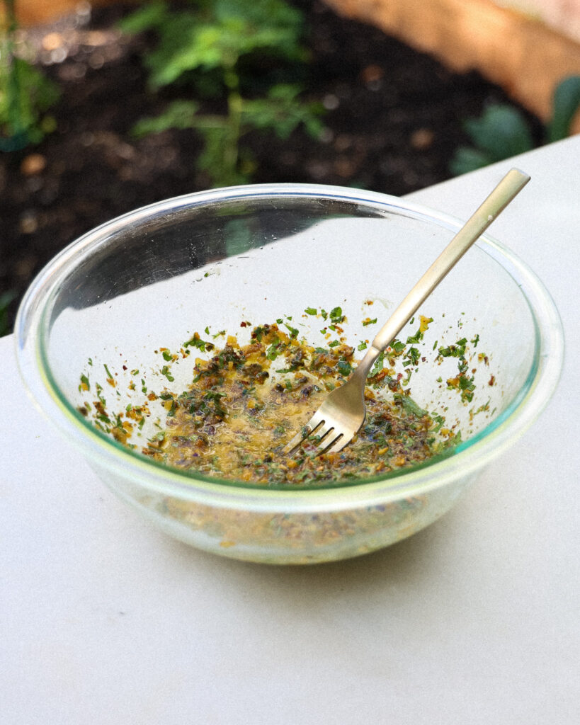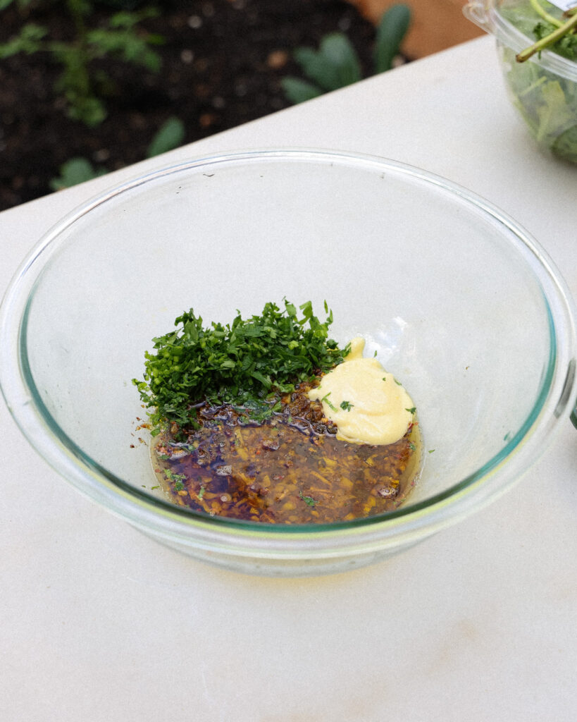 Chop half a lemon (yes, the rind too!), capers, and garlic. Sizzle them in olive oil with chili flakes until fragrant. You’ll know it’s time when the lemon goes from light yellow to golden. Add this to the bowl you plan to mix the salad in. Mix in Kewpie mayo, parsley, more lemon juice, and a pinch of salt for a creamy, punchy dressing.