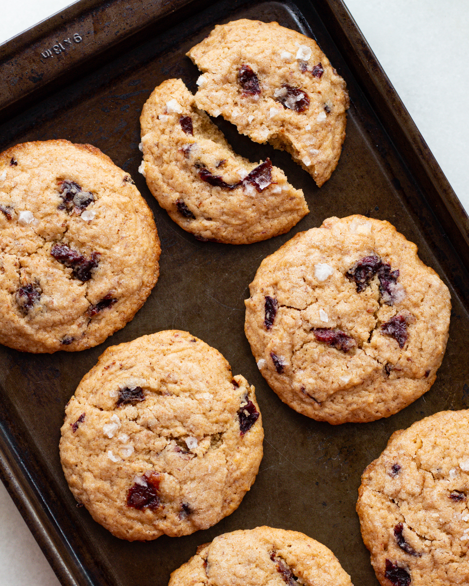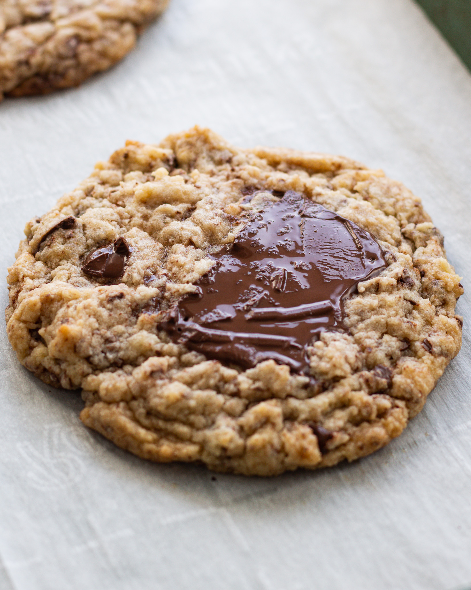 The baking is the fun part. You want to bake these cookies until they have spread, but still look a bit underdone. The residual heat from the oven will continue to cook the cookies, so after 20 minutes, they’ll be firm enough to hold, but their internal texture will be amazing, and it will be a texture the cookies will be able to hold onto for a few days. No crumbly or dry cookies here!
