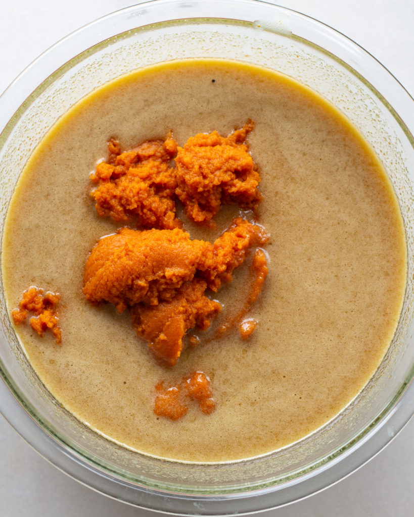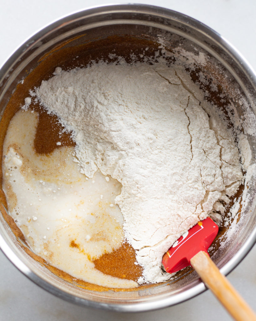 I used to mix the pumpkin in separately, but it just seemed like an unnecessary step. Do what you prefer here, just make sure not to add the milk yet, you’ll use it later!