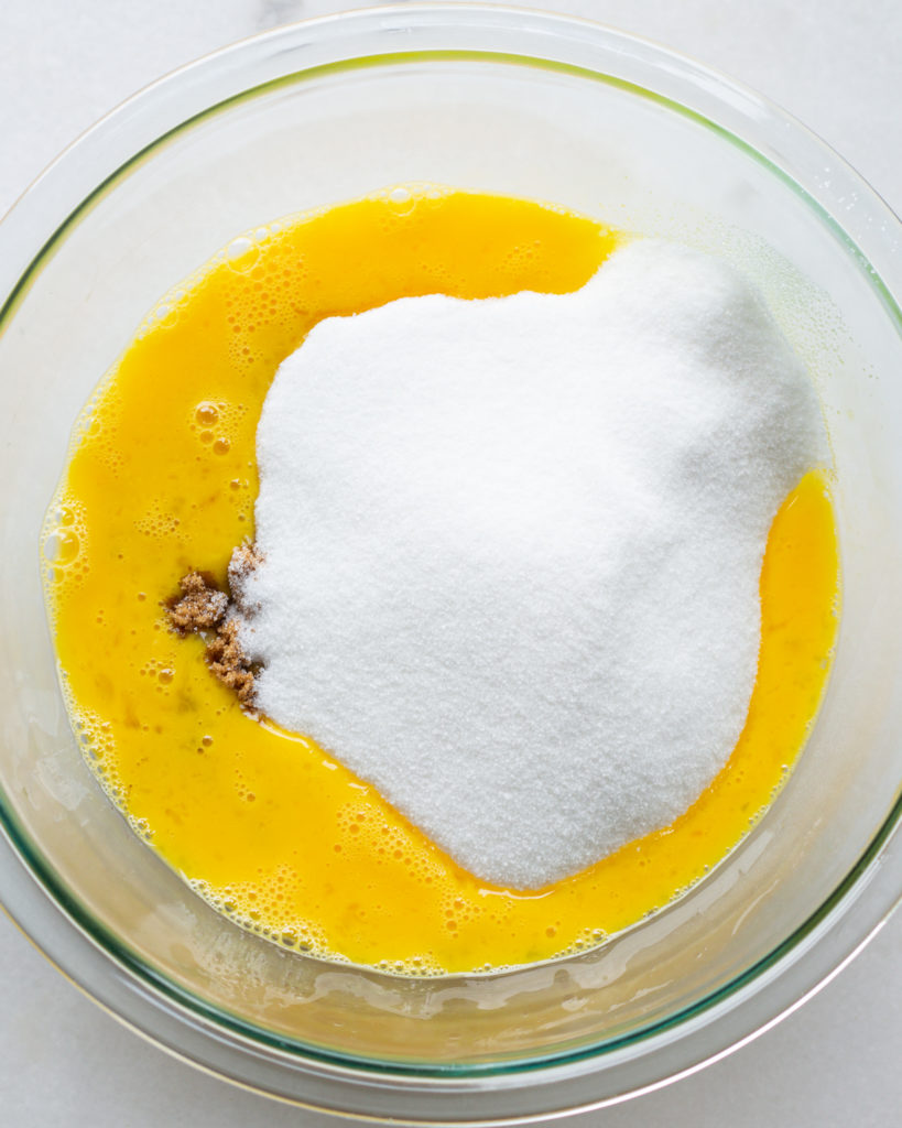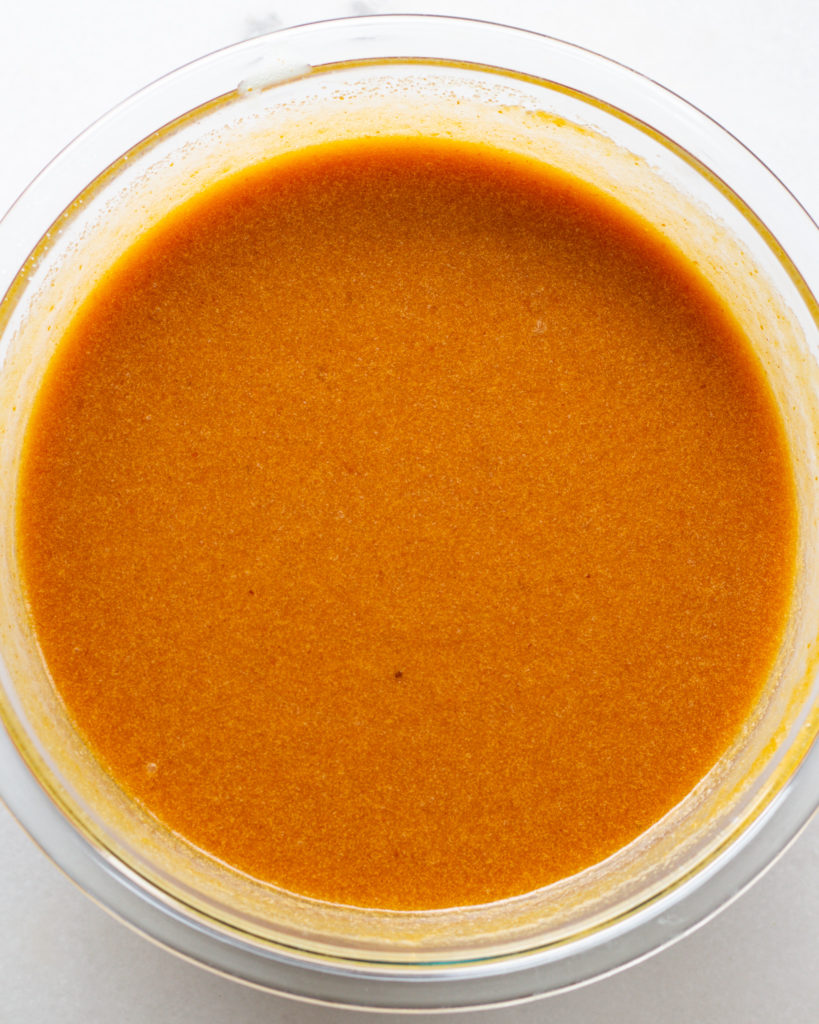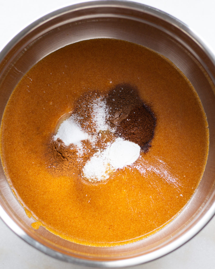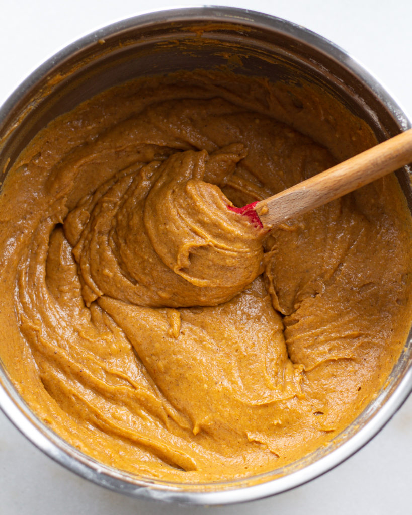 The wet ingredients here are not an exact science, but I recommend beating the eggs first, then adding the sugars, brown butter and pumpkin all at once. You’ll want to beat this until it is smooth as possible.